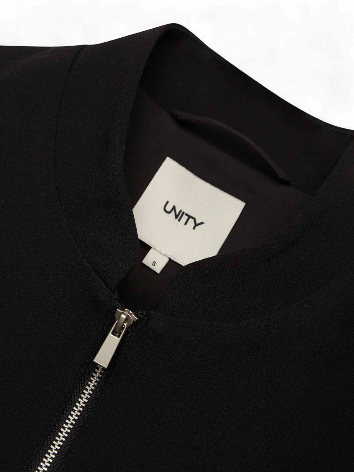 Unity, kitten, jacket, black, chaqueta con un diseño esencial y contemporáneo, caracterizada por una línea limpia y una construcción minimalista. Confeccionado en tejido técnico compuesto de poliéster, rayón y elastano, ofrece una estructura compacta con una ligera elasticidad que garantiza la comodidad y la libertad de movimiento. El cierre frontal con cremallera metálica mejora la estética moderna de la prenda, mientras que los bolsillos de parche con solapa añaden funcionalidad y mantienen un equilibrio formal. Corte regular, ideal para un uso urbano y diario., tejido técnico de mezcla de poliéster, rayón y spandex, construcción limpia con un diseño minimalista, cierre frontal con cremallera, bolsillos de parche con solapa, línea esencial contemporánea, corte regular.