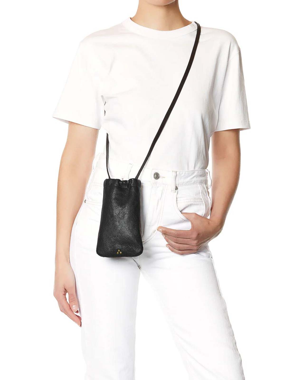 funda blanda para teléfono móvil con correa de hombro de piel fina. Longitud de la correa de hombro 117 cm., soporte para móvil 100% cabra, forro 100% algodón, dimensiones: 12,5 x 20 cm