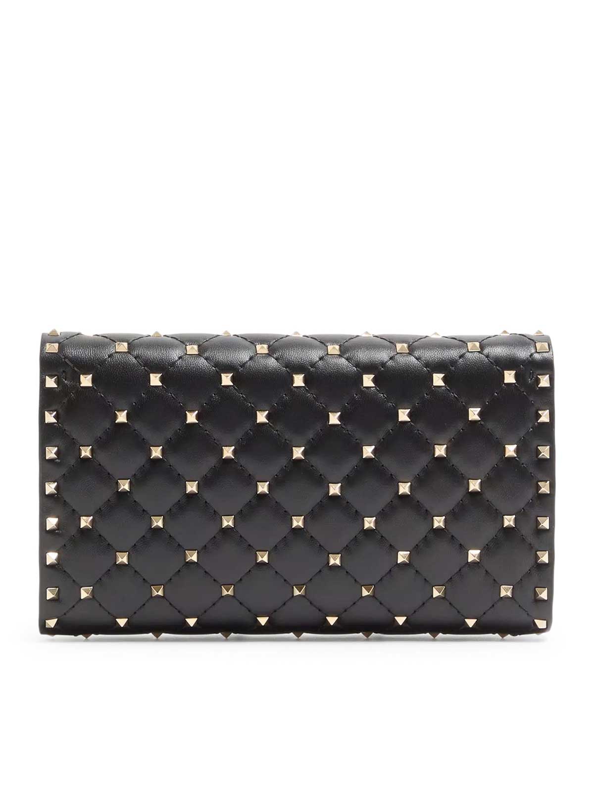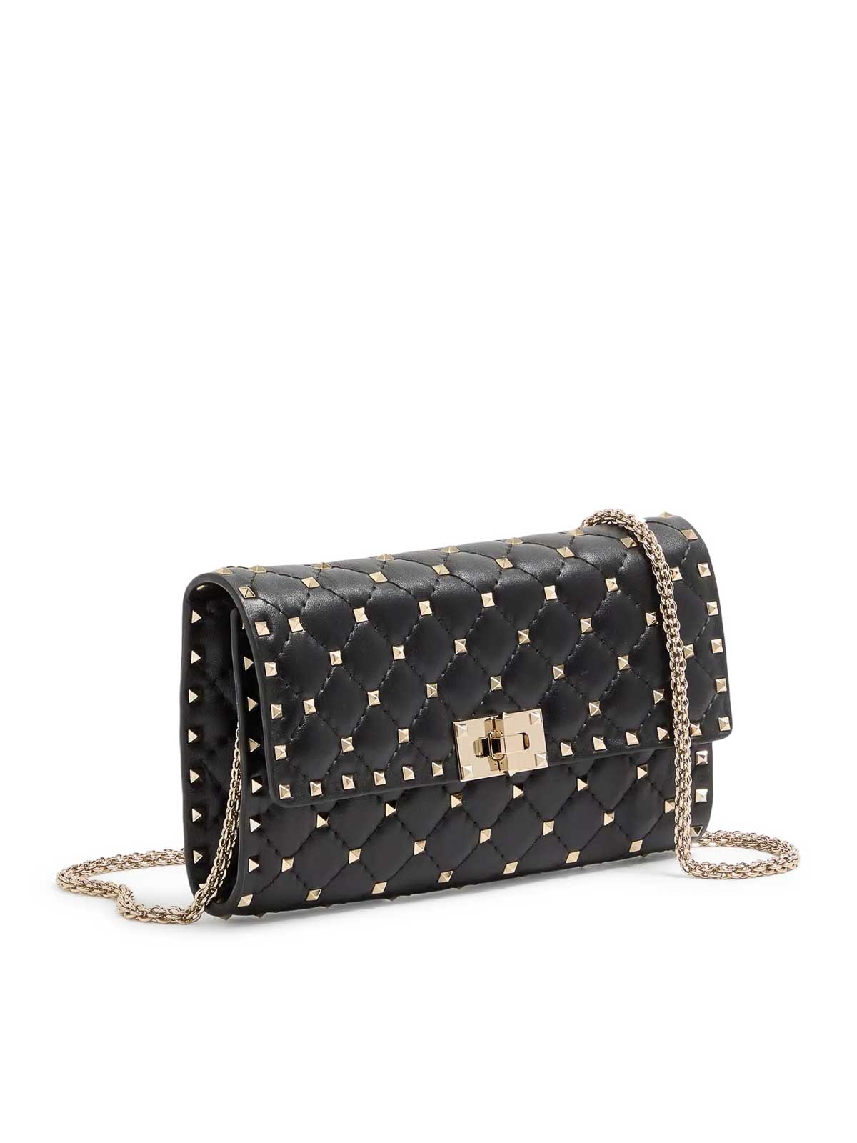 acolchado y decorado con pequeñas tachuelas, se puede llevar sobre el hombro o bandolera o llevarlo a mano gracias a la cadena extraíble, piel de napa acolchada, estampado de diamantes delineado por costuras tono sobre tono, tachuelas y herrajes con acabado en platino, solapa con cierre giratorio, forro de piel napa, interior: bolsillo de piel roja con cremallera y 8 ranuras para tarjetas, color: negro