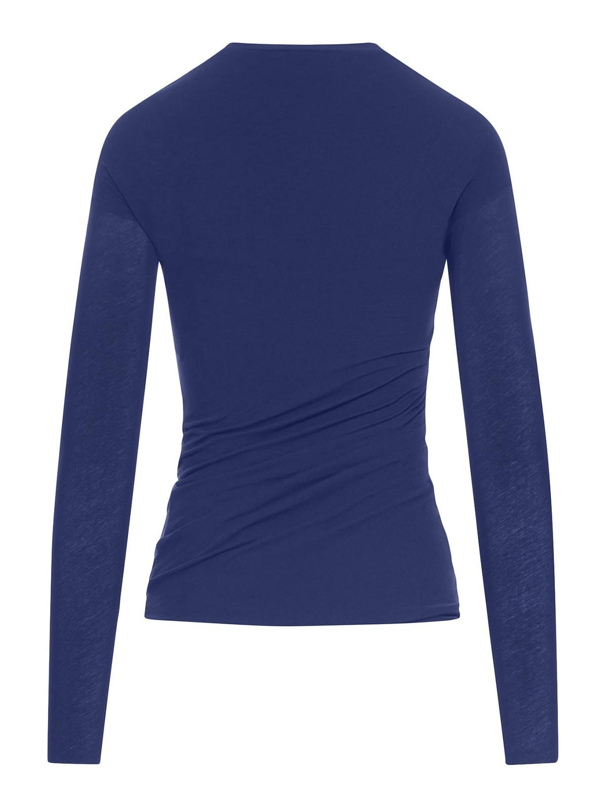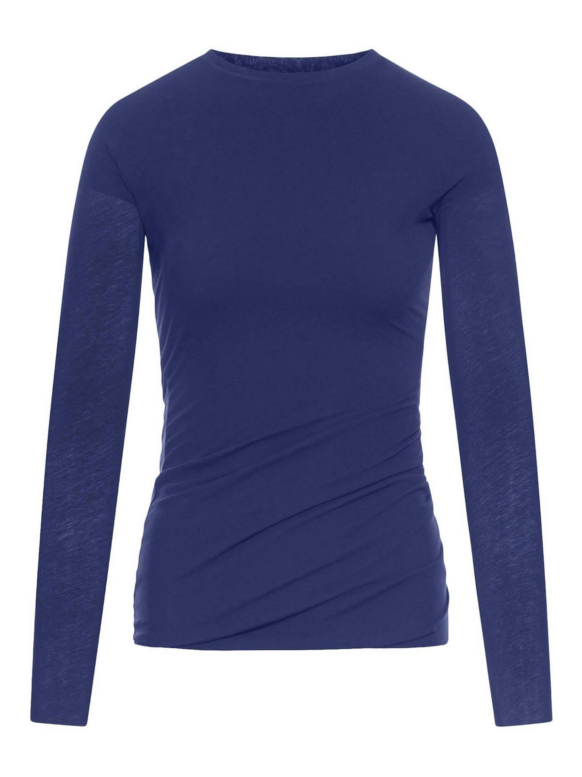 cuello redondo, mangas largas y ligeramente transparentes, drapeado lateral con pliegues, dobladillo recto, corte ajustado, 100% algodón, color: azul tinta