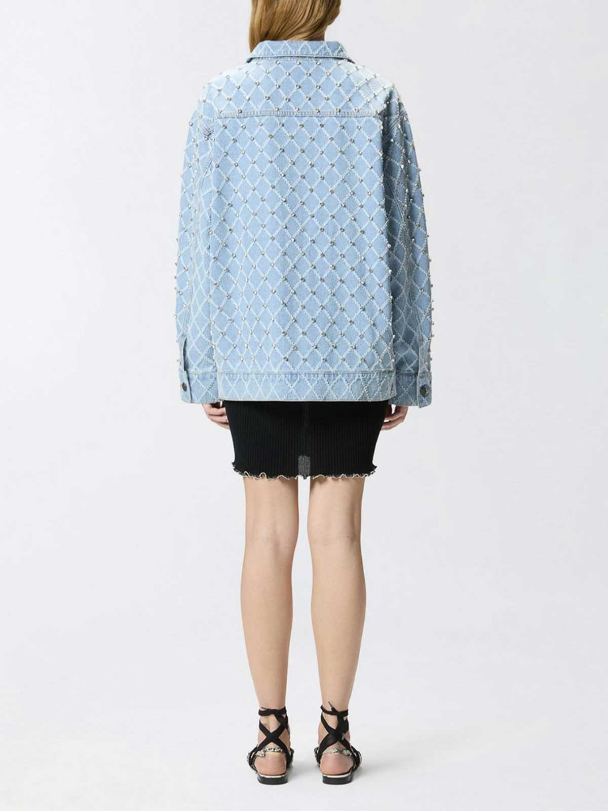 Chaqueta vaquera rosa con estampado de diamantes y pedrería, con cuello camisero, bolsillos de parche en la parte delantera con solapas y botones y puños abotonados.