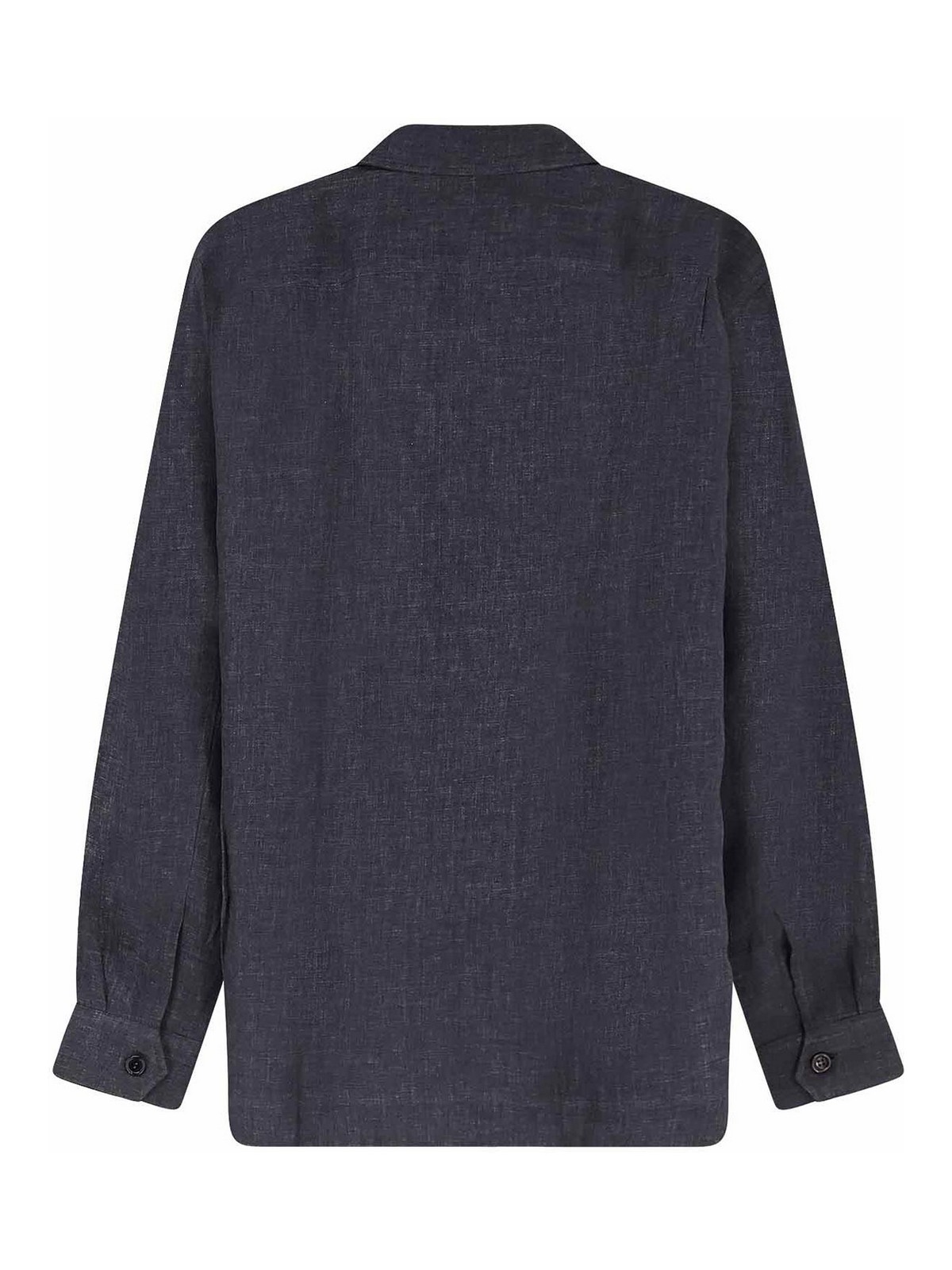 Cierre con botones, cuello puntiagudo, cuatro bolsillos de parche en la parte delantera, mangas largas con puños y botones, ajuste fácil, fabricado en Italia, 100% lino.
