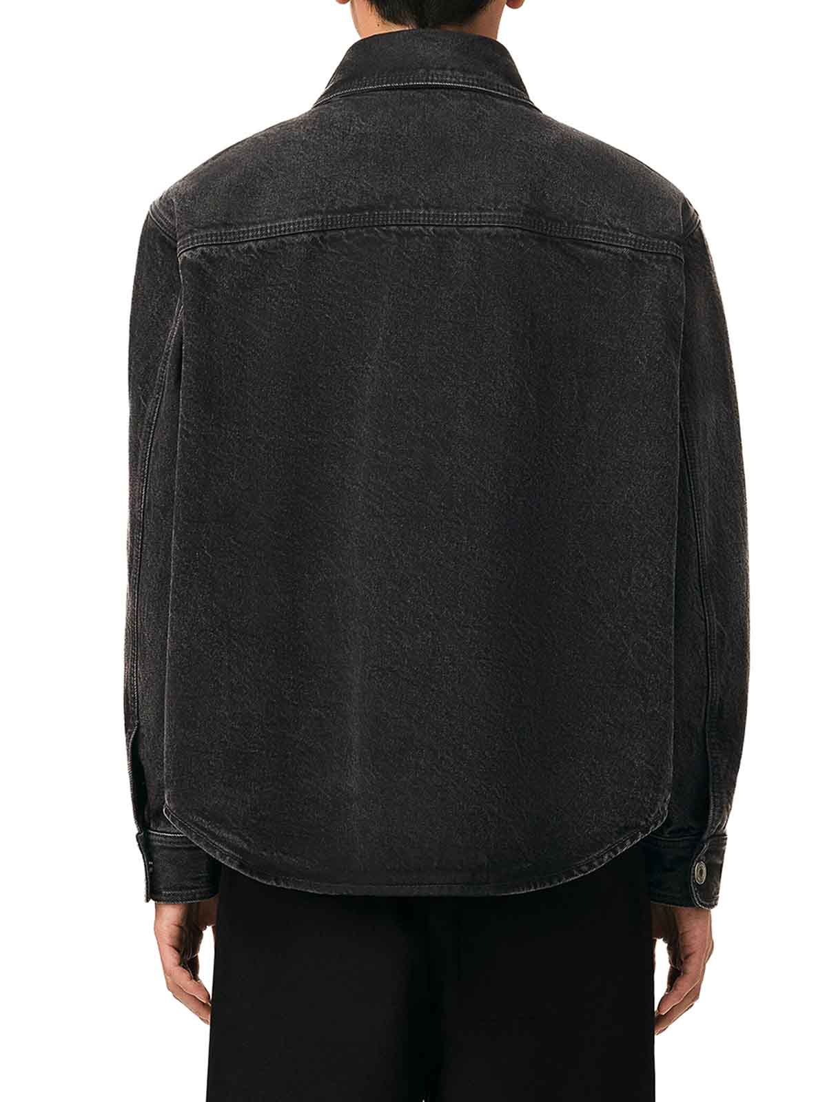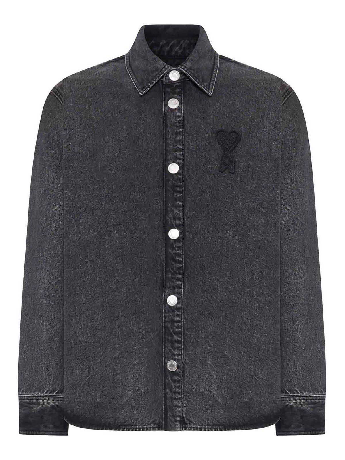 camisa vaquera negra desgastada, producto unisex, cuello clásico, broches estilo vaquero en tono níquel, aplique ami de coeur negro tejido a ganchillo en el pecho, costuras negras, la modelo mide 186 cm de altura y lleva una talla M, 100% algodón, color: negro desgastado