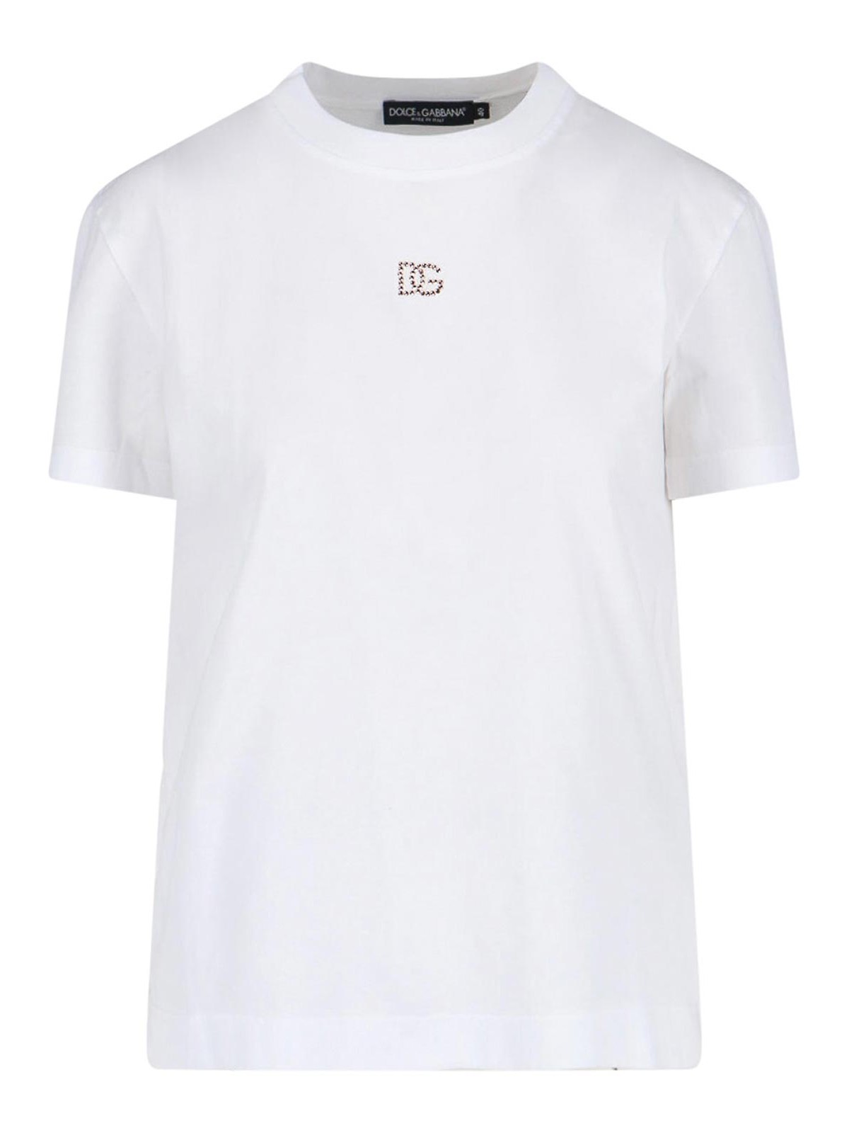 Camiseta con el logotipo de Dolce & Gabbana en algodón blanco, cuello redondo, manga corta, logotipo de strass en la parte delantera, dobladillo recto.