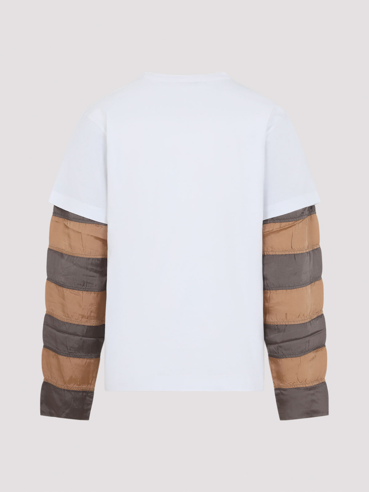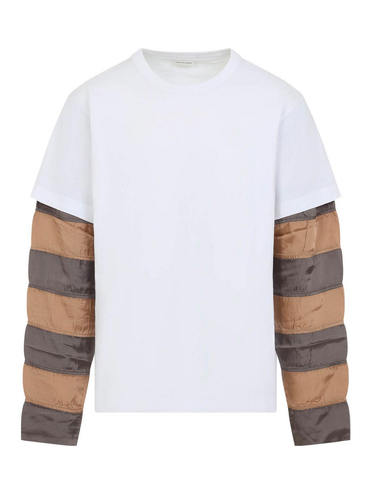 Camiseta de algodón blanco Dries van noten heedar ls. Confeccionada en punto de algodón blanco, con cuello redondo, hombros caídos, mangas en capas de satén beige y marrón y dobladillo recto.