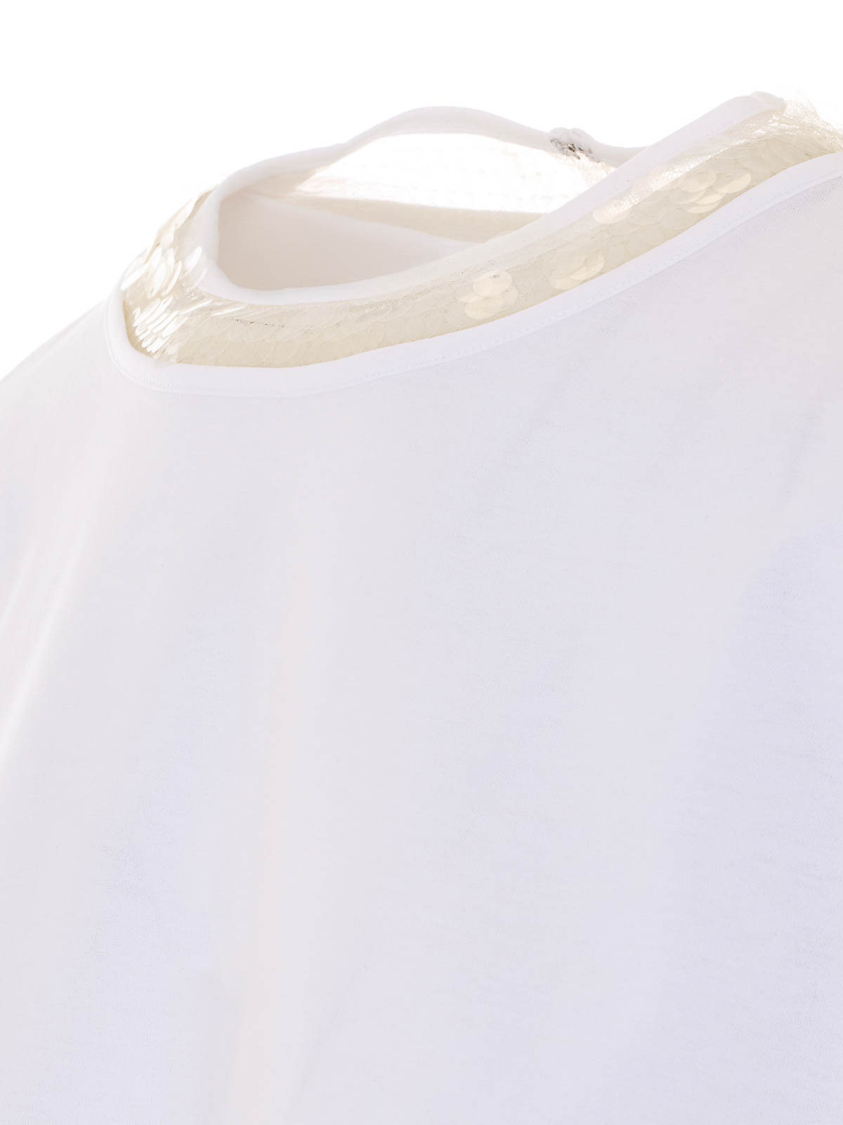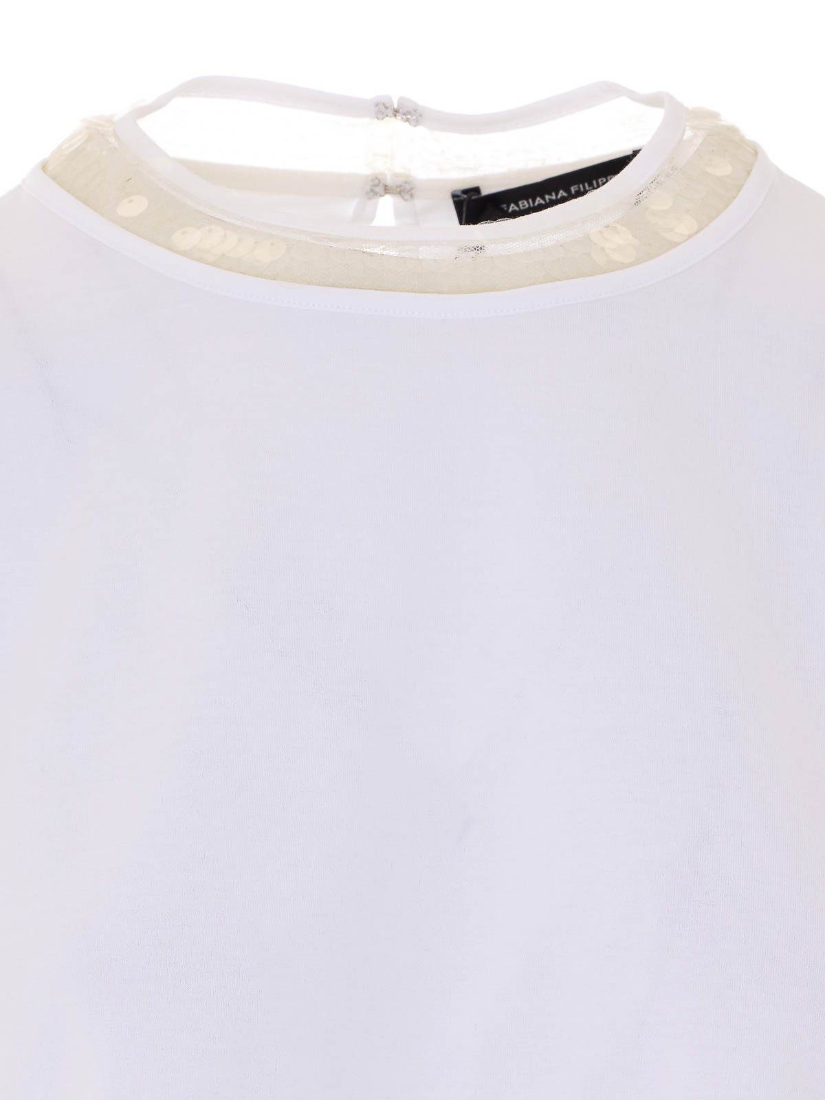Camiseta blanca de Fabiana Filippi, cuello redondo, cierre de gancho en la espalda, detalles de lentejuelas en toda la prenda