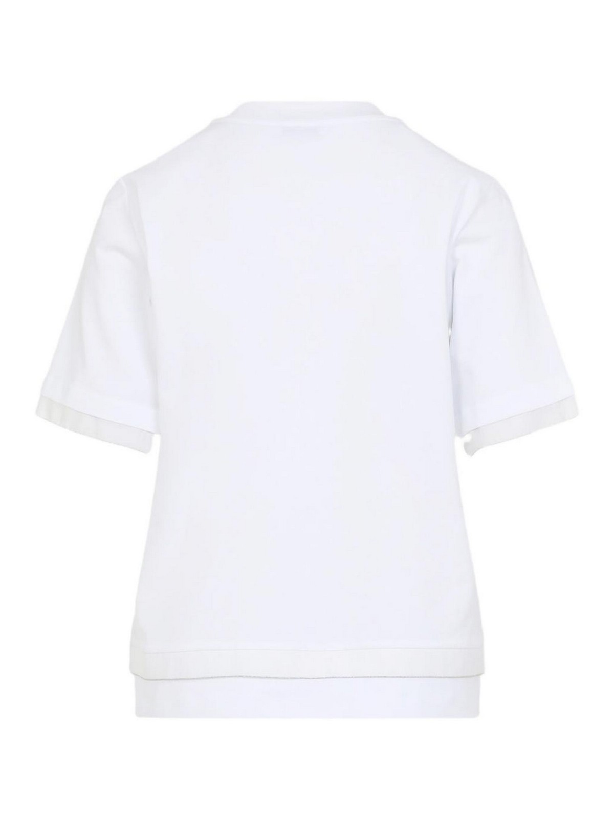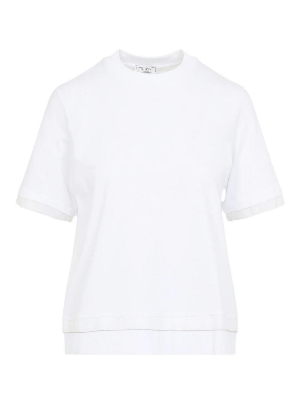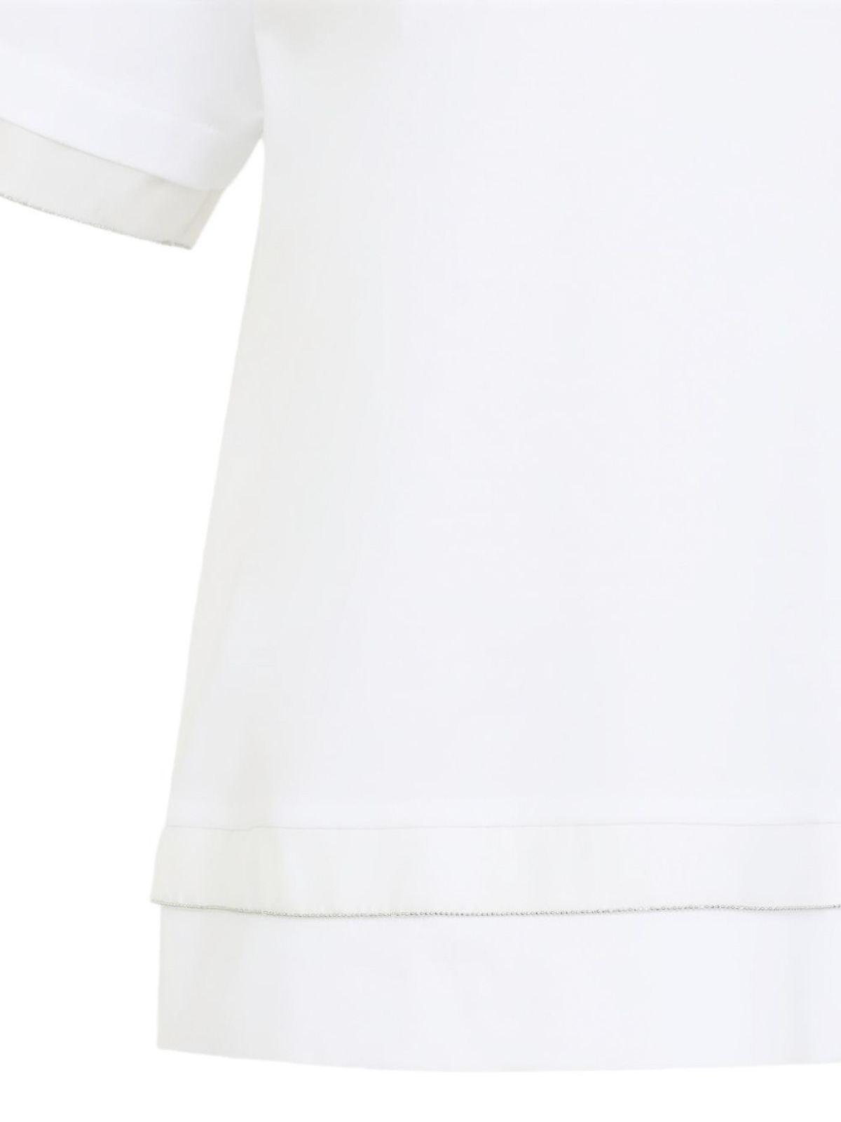 Diseño de capas blancas, mangas cortas, cuello redondo, costuras tonales, dobladillo recto