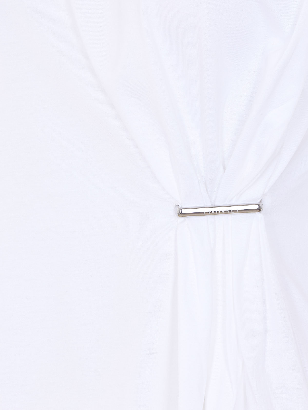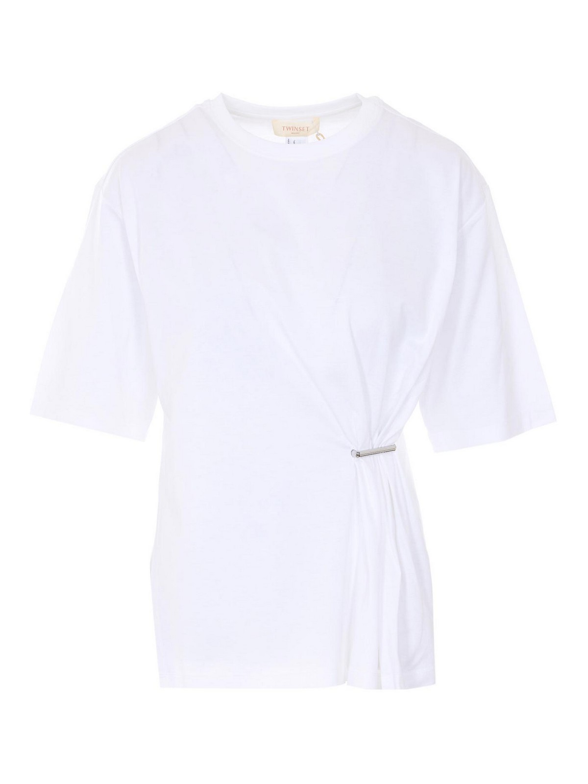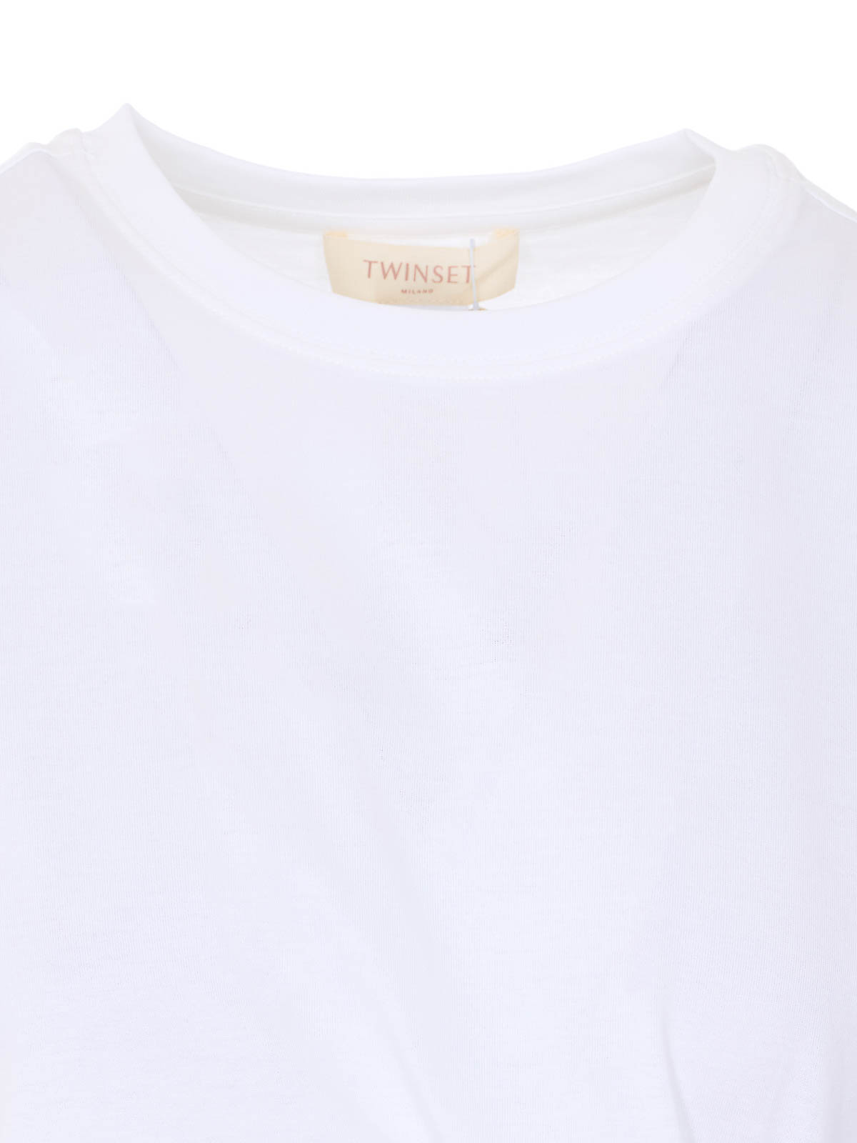 Camiseta blanca Twinset, cuello redondo, logo con placa en el lateral, volante, detalle de abertura lateral