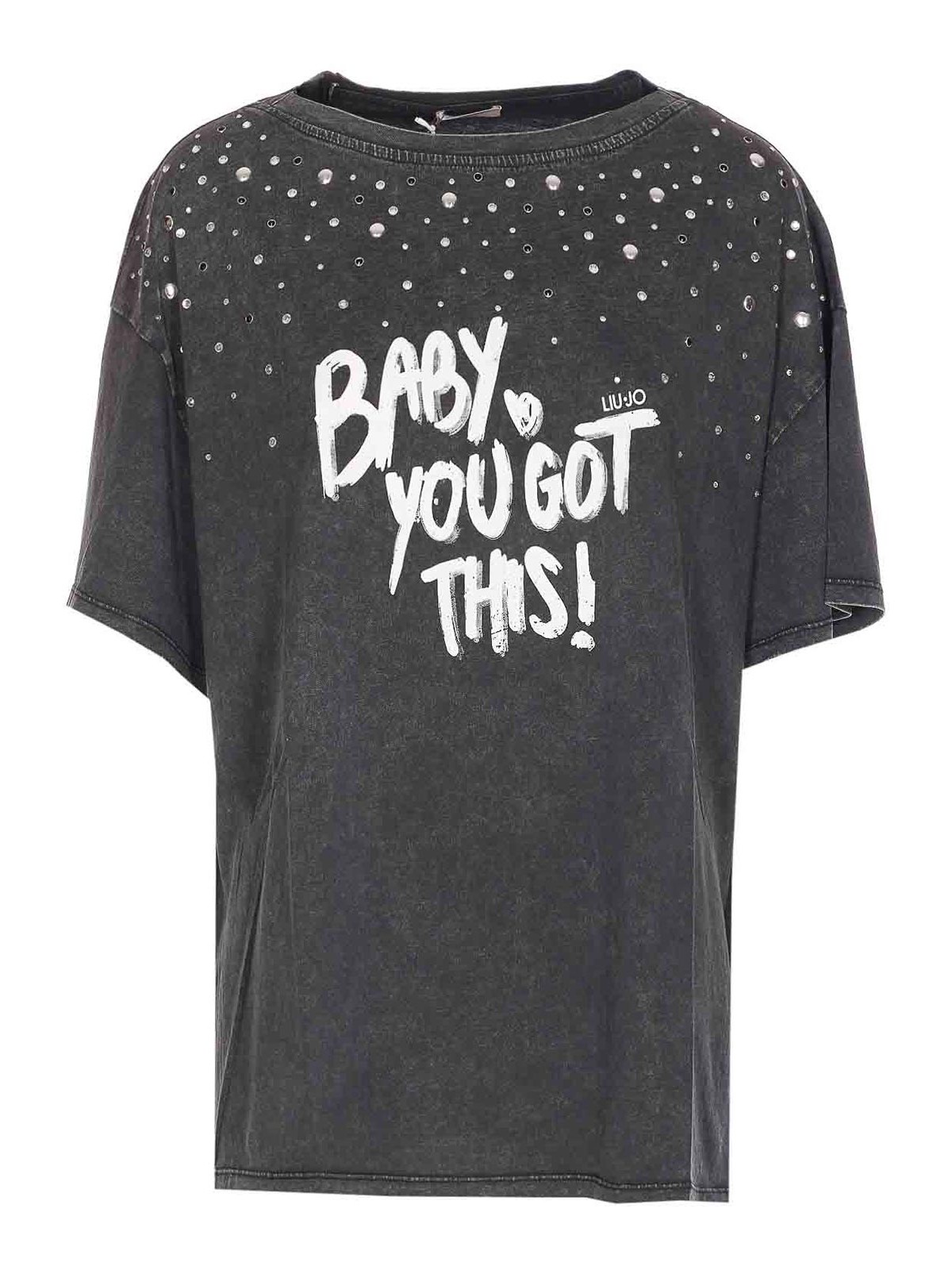 Camiseta gris Liu jo, cuello redondo, estampado en la parte delantera, detalles en la parte delantera
