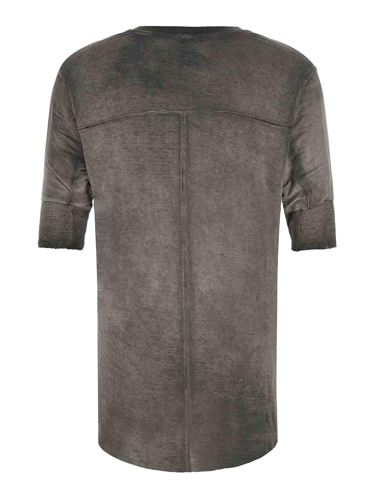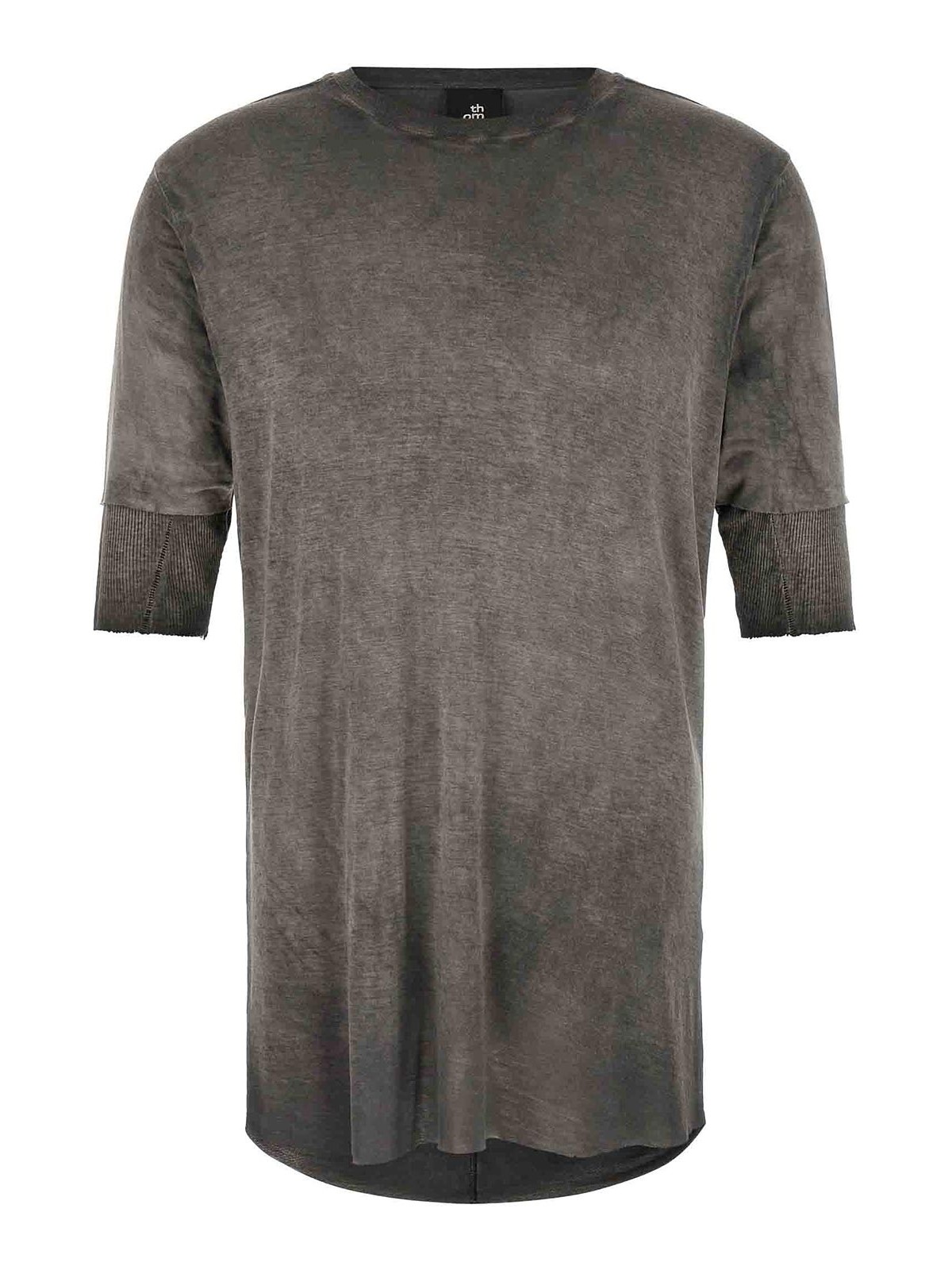 Camiseta modal ligera y elástica de 940 pies con efecto dlav, dobladillo de corte crudo, cuello redondo, costuras en la espalda, mangas cortas de doble capa con inserto de punto acanalado de algodón y lino tono sobre tono.