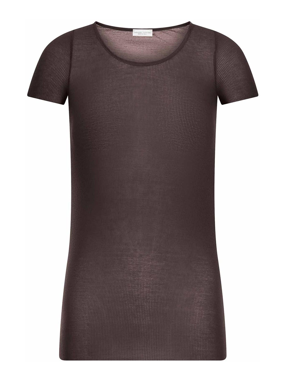 camiseta acanalada de punto fino, diseño semitransparente, escote ancho y redondo, manga corta, corte ajustado, longitud regular, dobladillo recto, 100% algodón, color: marrón oscuro