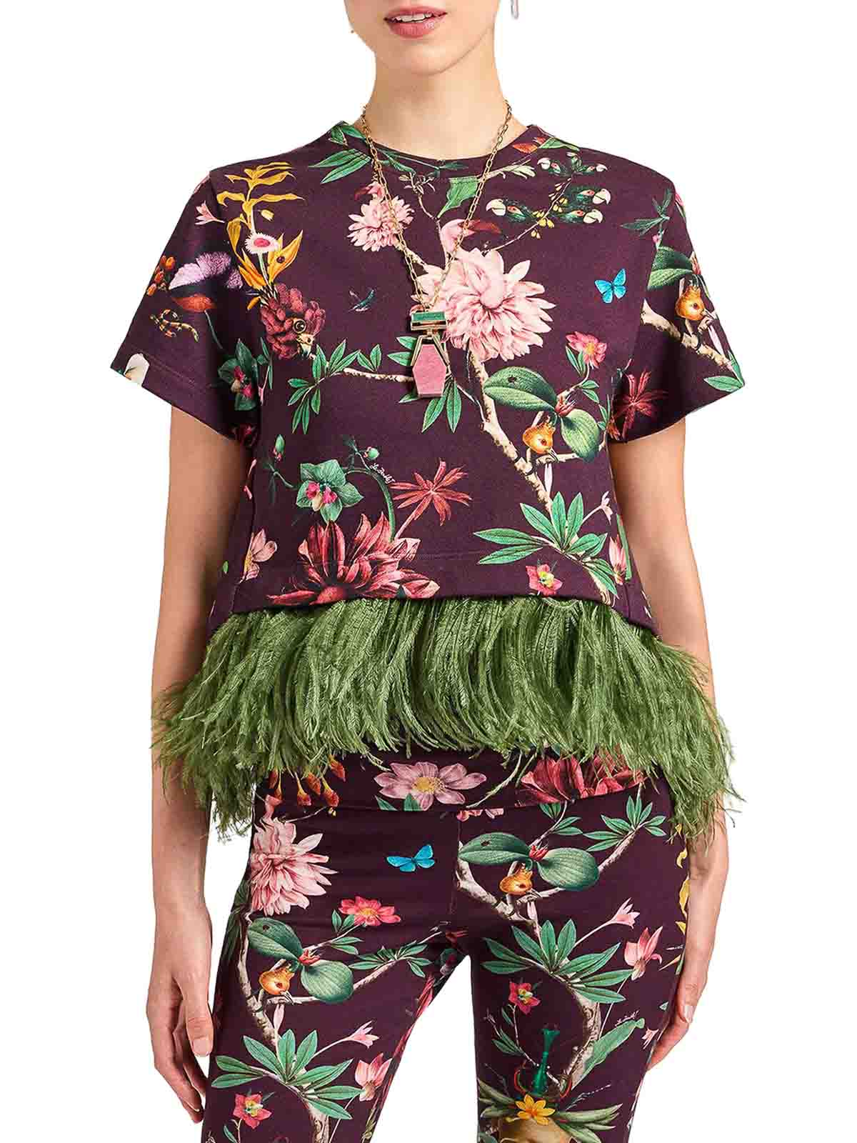 jersey, cuello redondo, silueta corta, ribete de plumas de avestruz, color: multicolor