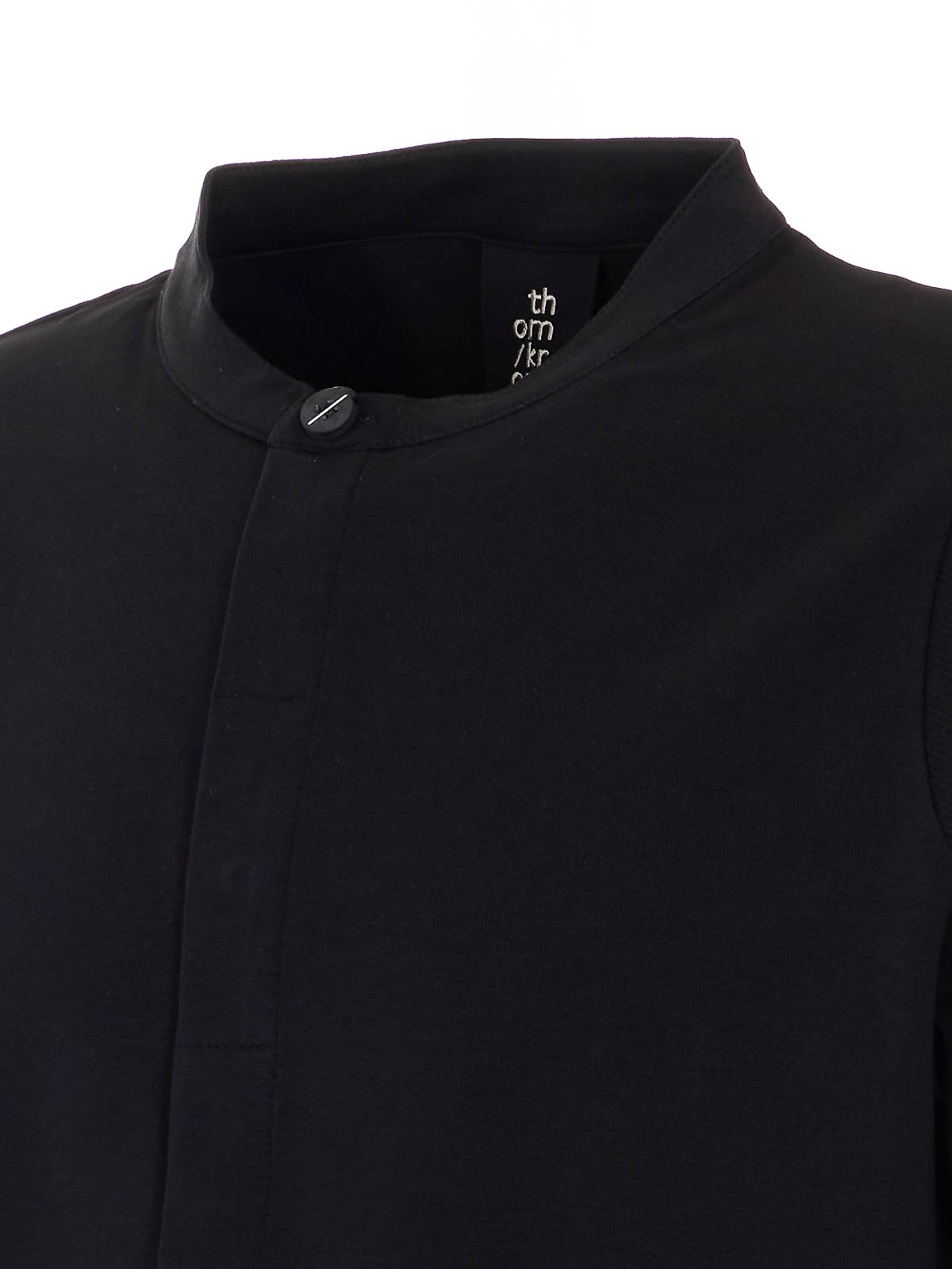 Camiseta negra de Thom Krom, cuello redondo, detalle de botones, manga corta, corte holgado