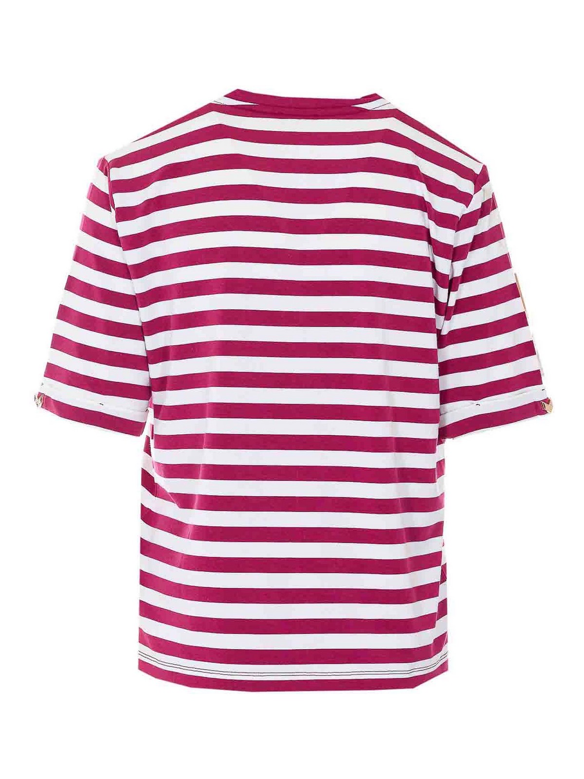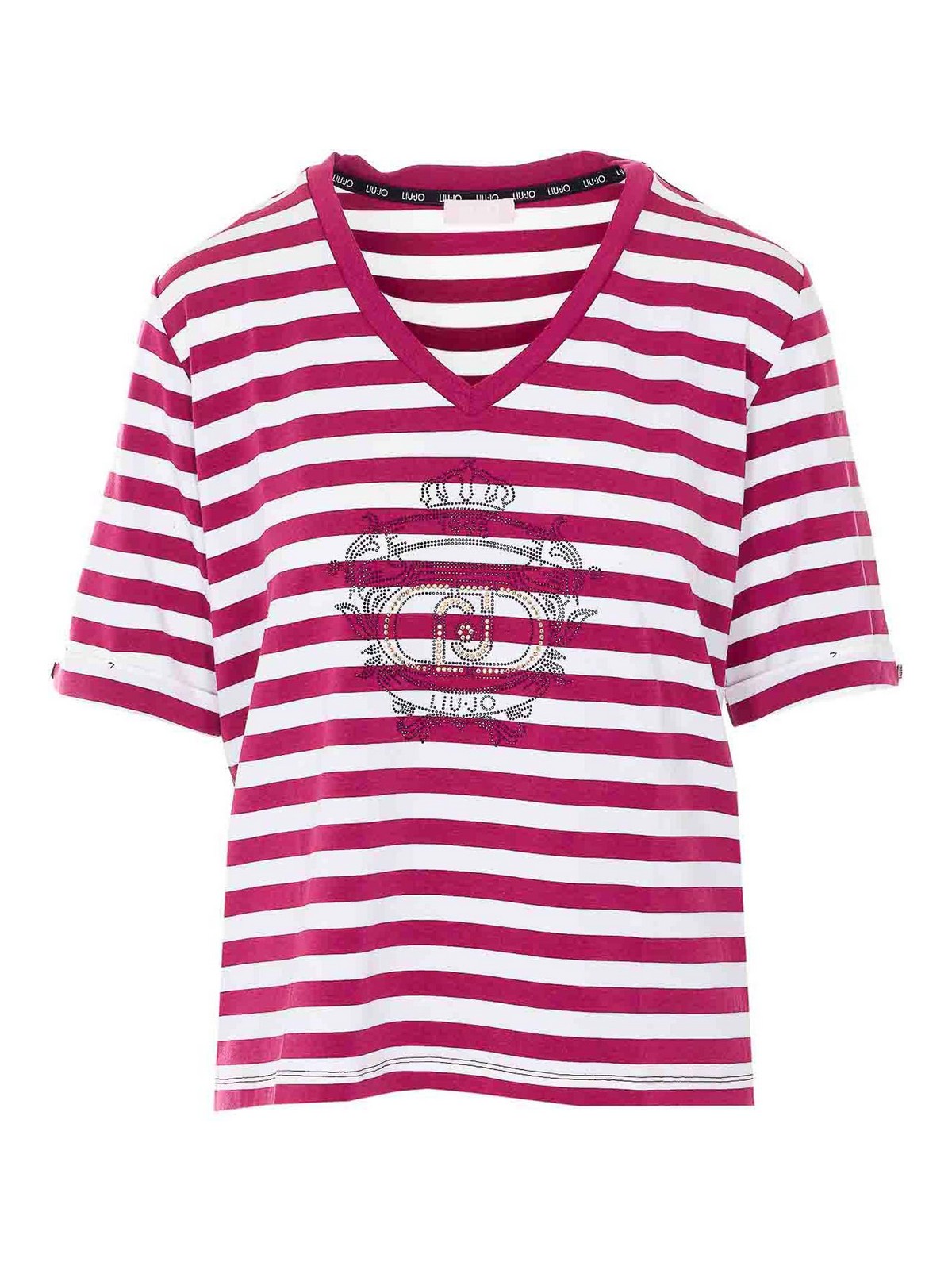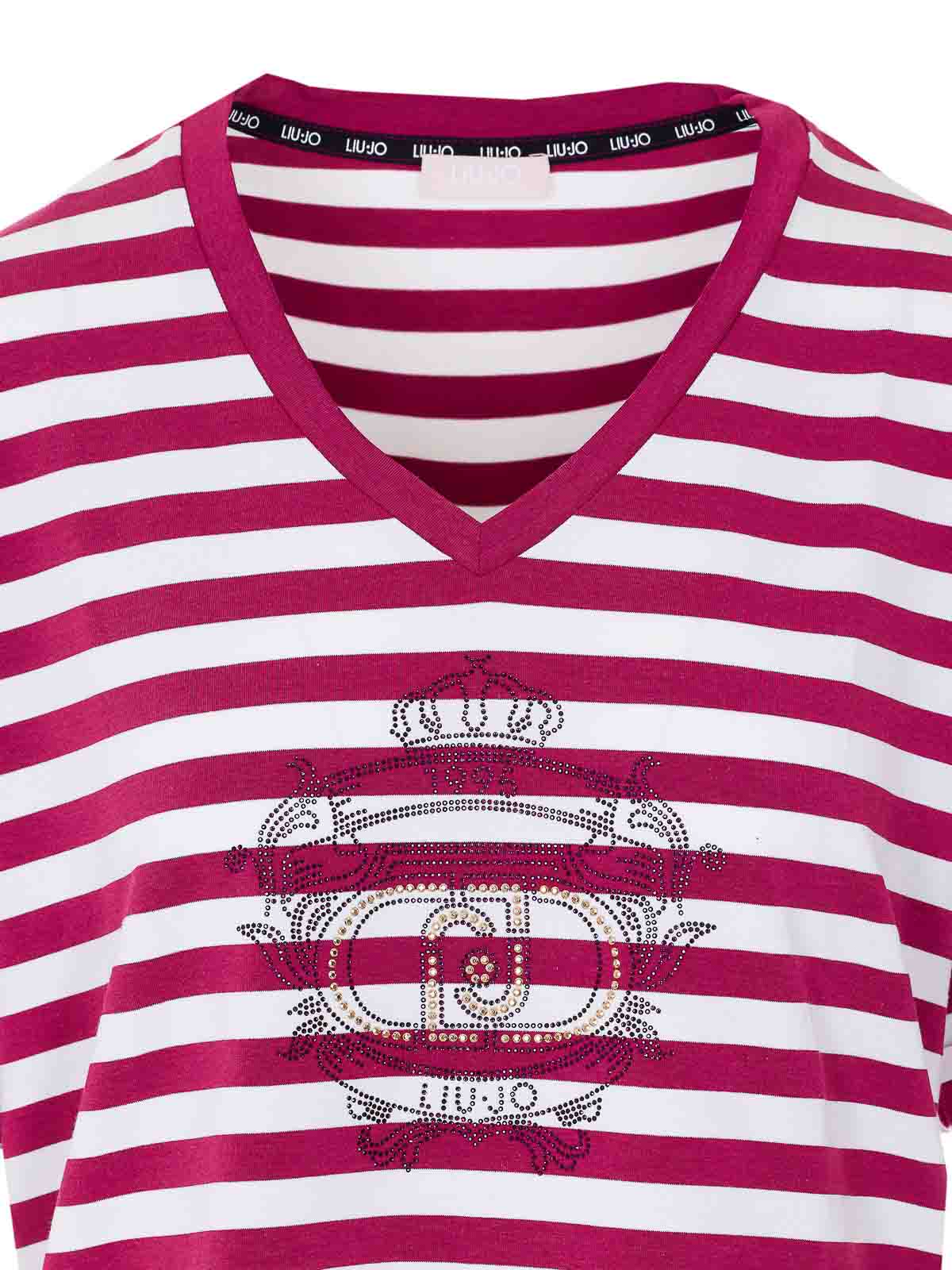 Camiseta Liu jo a rayas rojas y blancas, cuello en V, detalles de strass en la parte delantera