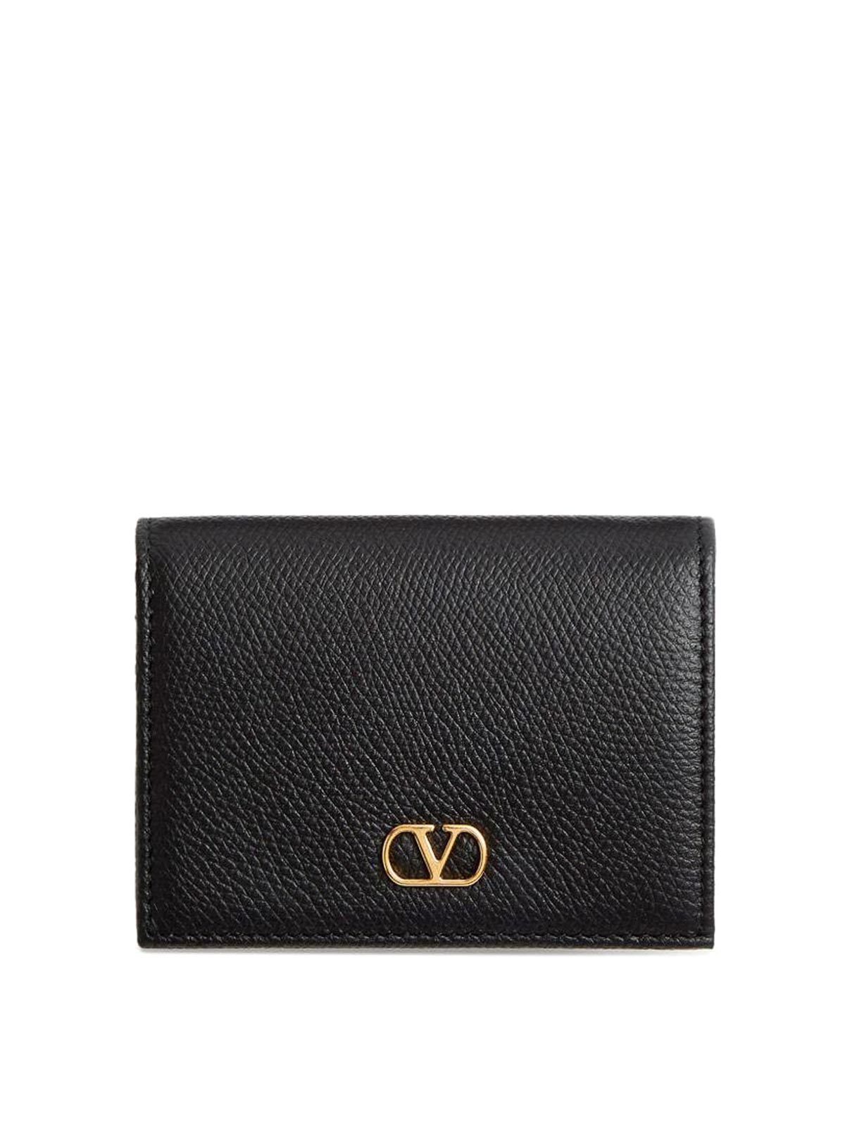 Cartera Valentino de piel de becerro negra con textura granulada, placa con el logotipo en tono dorado en la parte superior desplegable con ranuras internas para tarjetas con cierre a presión. El look completo incluye accesorios de Valentino Garavani.