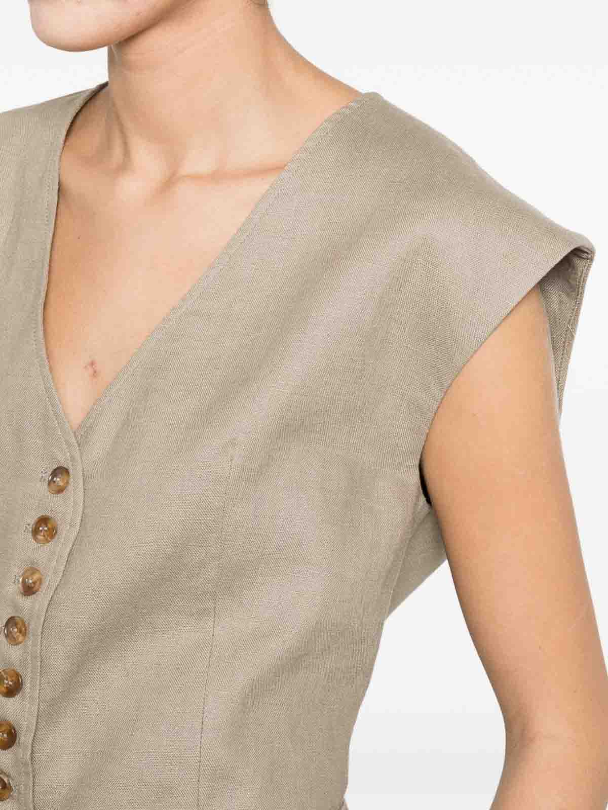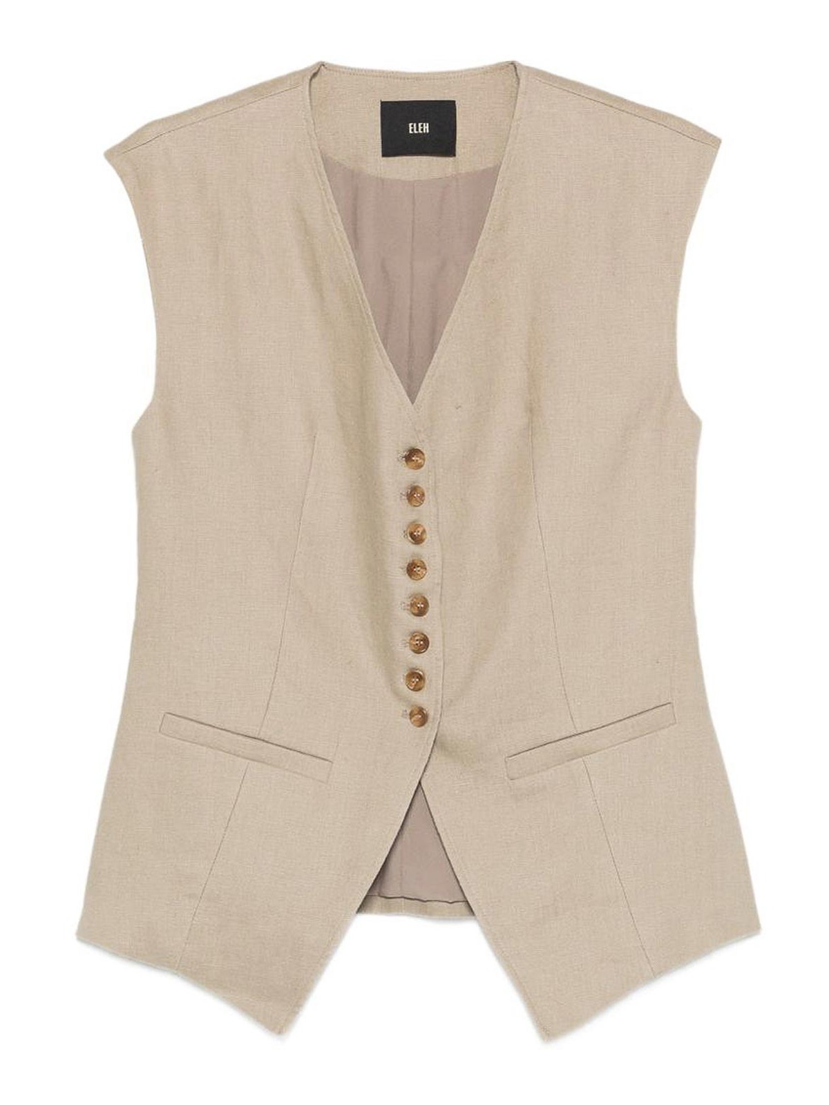Chaleco de lino beige de eleh, con cuello en V, cierre con botones en la parte delantera, bolsillos con solapa y una silueta ajustada que favorece la figura. Su diseño limpio y refinado hace que este chaleco sea ideal para un estilo diario elevado, atuendos casuales y elegantes o looks coordinados. Una pieza versátil y sofisticada, perfecta para realzar el armario con una estética sutil y moderna.