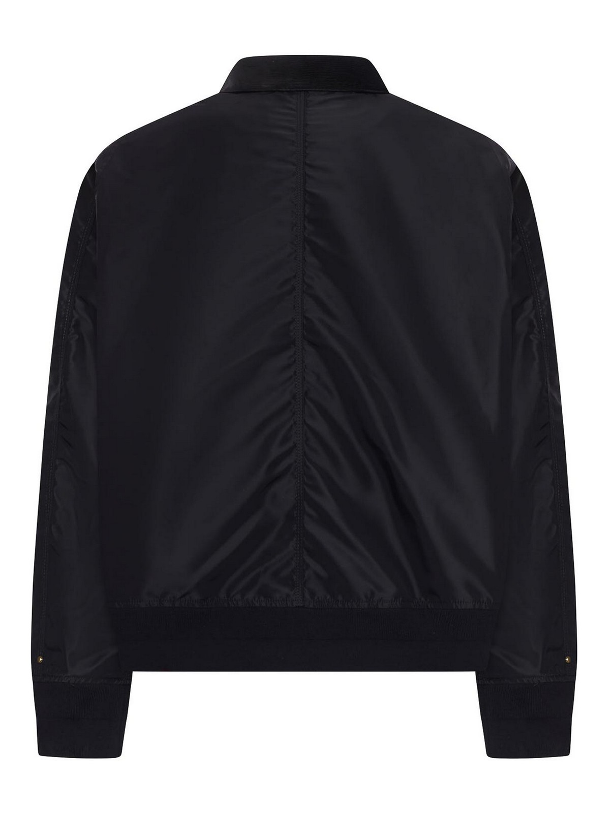 cierre frontal con cremallera metálica en tono dorado, cuello acanalado clásico, bolsillos frontales de parche con solapas y botones metálicos, detalles metálicos en contraste, bolsillo con cremallera en la manga, dobladillo y puños acanalados, la espalda presenta un ligero drapeado central, color: negro