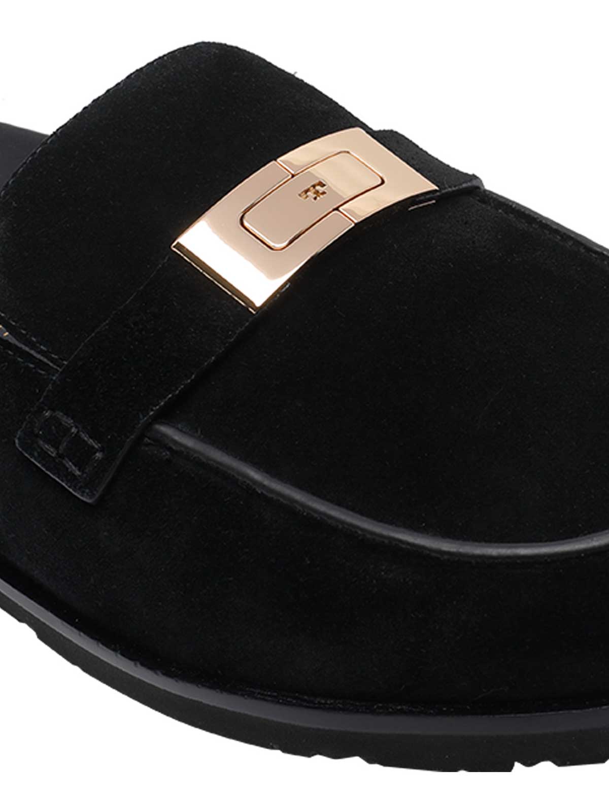 Mules Tory Burch negros con tachuelas, punta redonda, detalle frontal, parte superior de gamuza