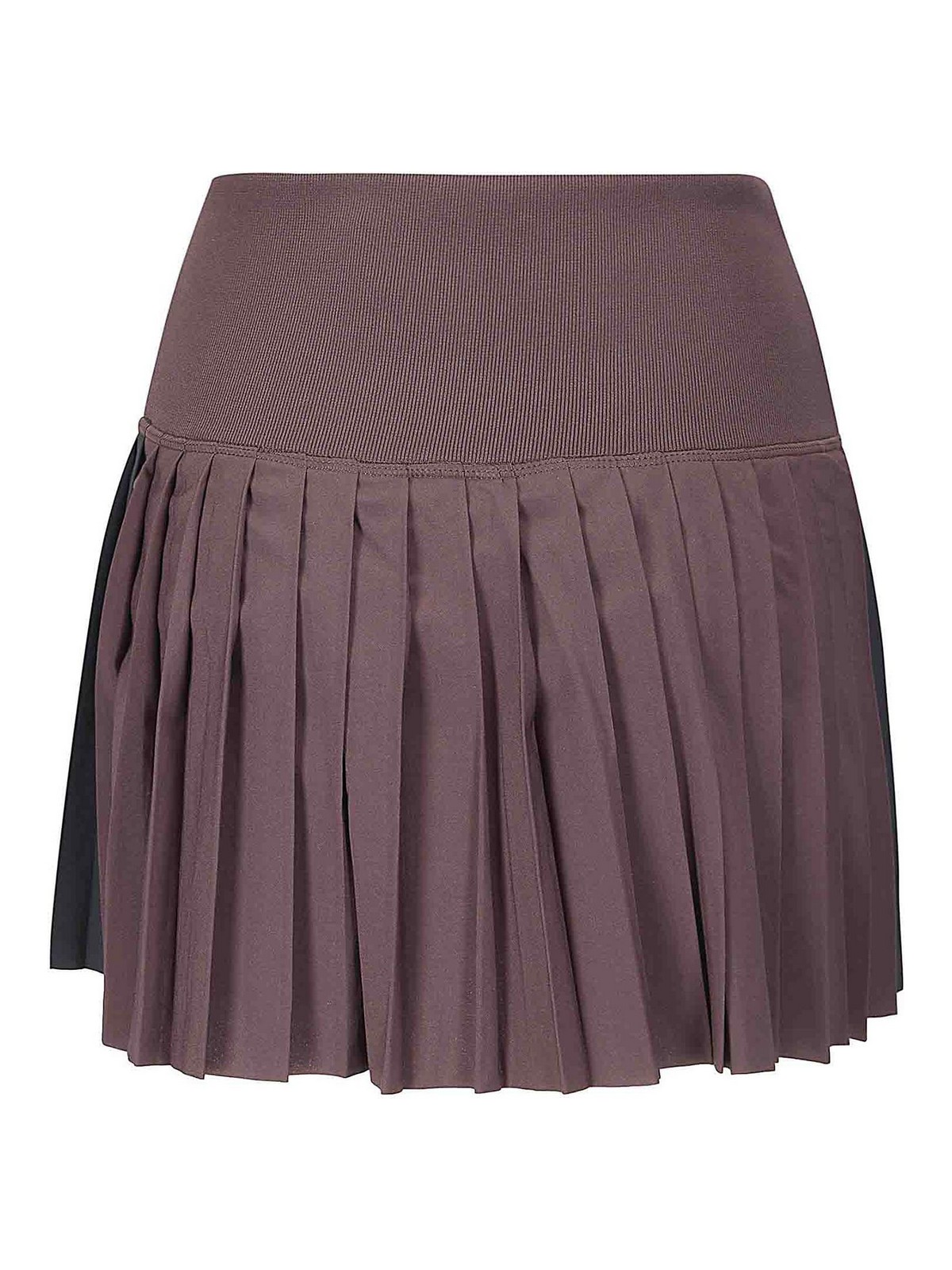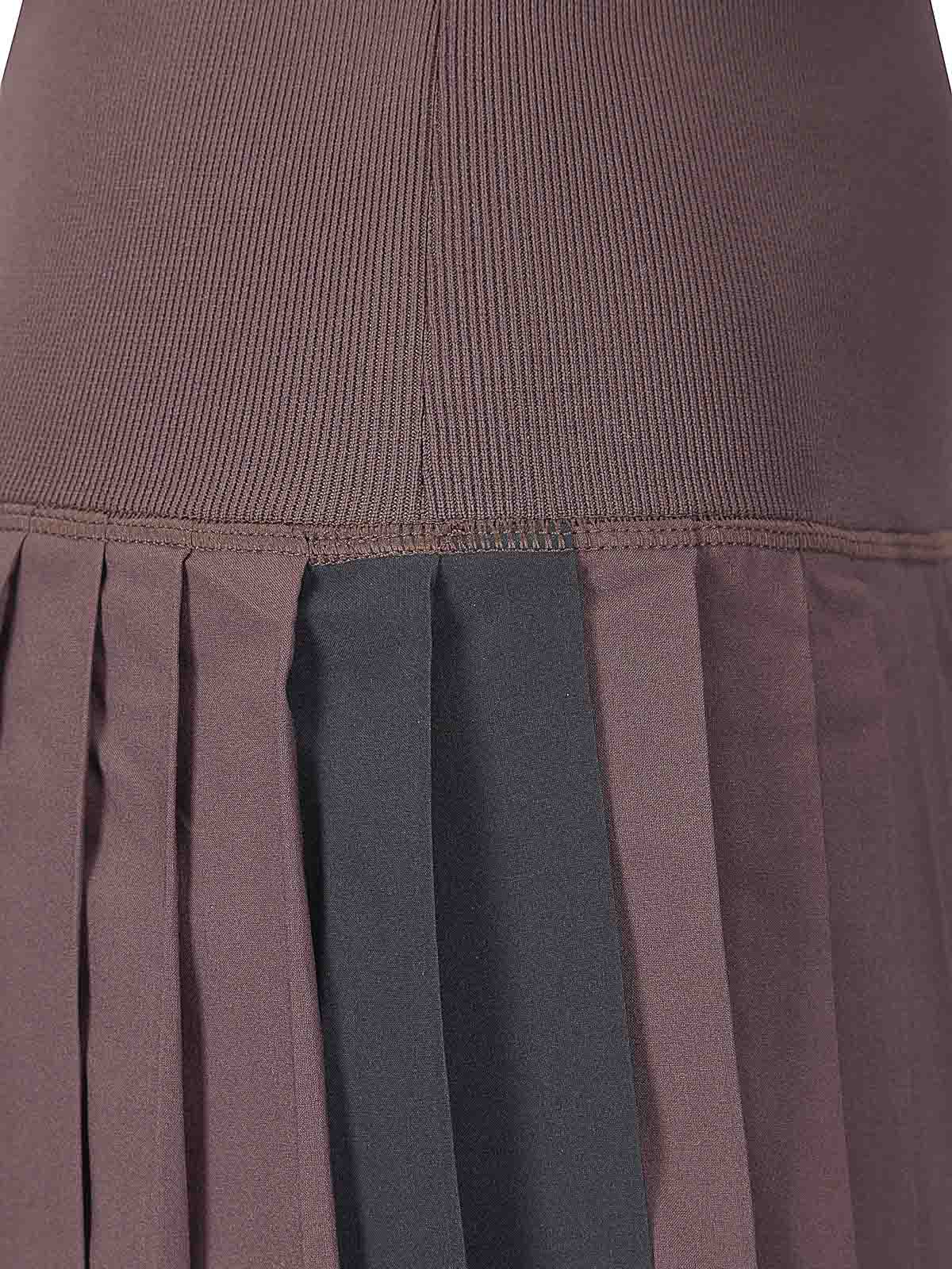 Falda corta plisada con pantalones cortos, cintura alta con banda elástica, detalle de tela a contraste en los laterales.