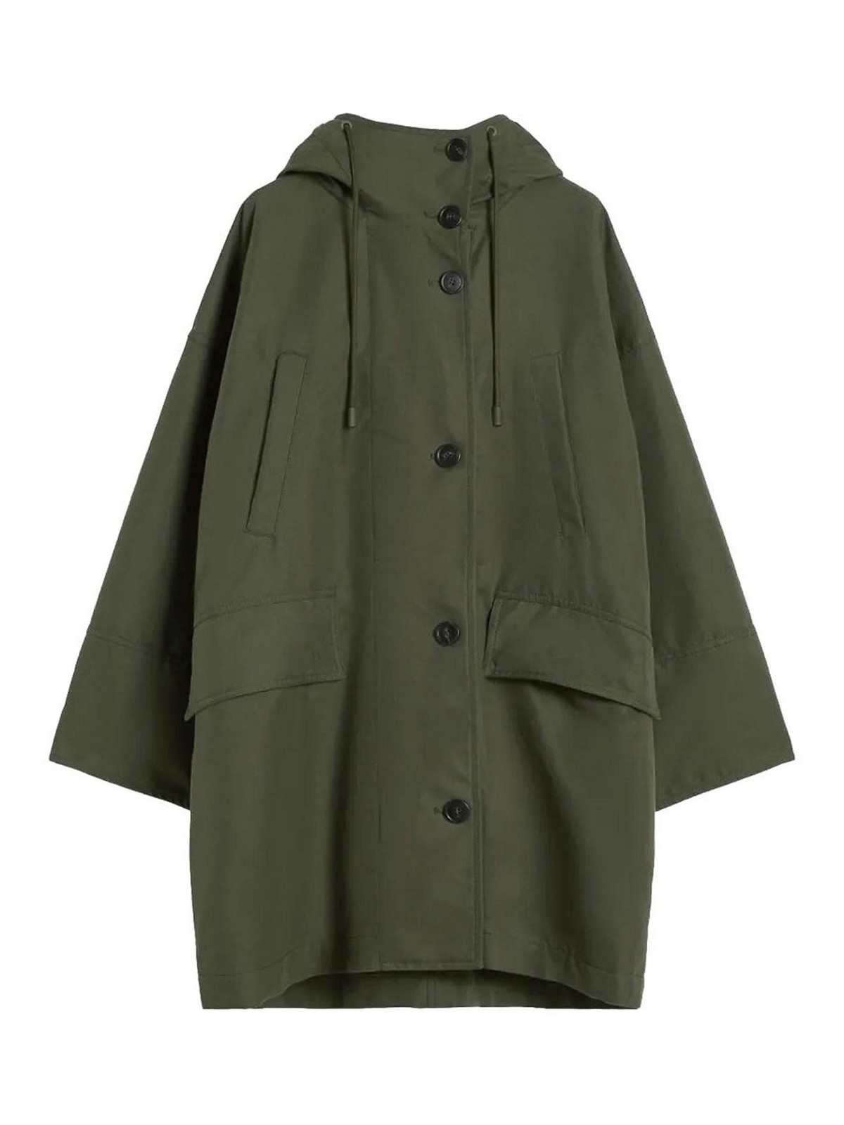 chaqueta con capucha y botones, cierre de botones con capucha verde, bolsillos frontales con solapa, mangas largas. Capucha interna forrada con pelo libre de crueldad animal