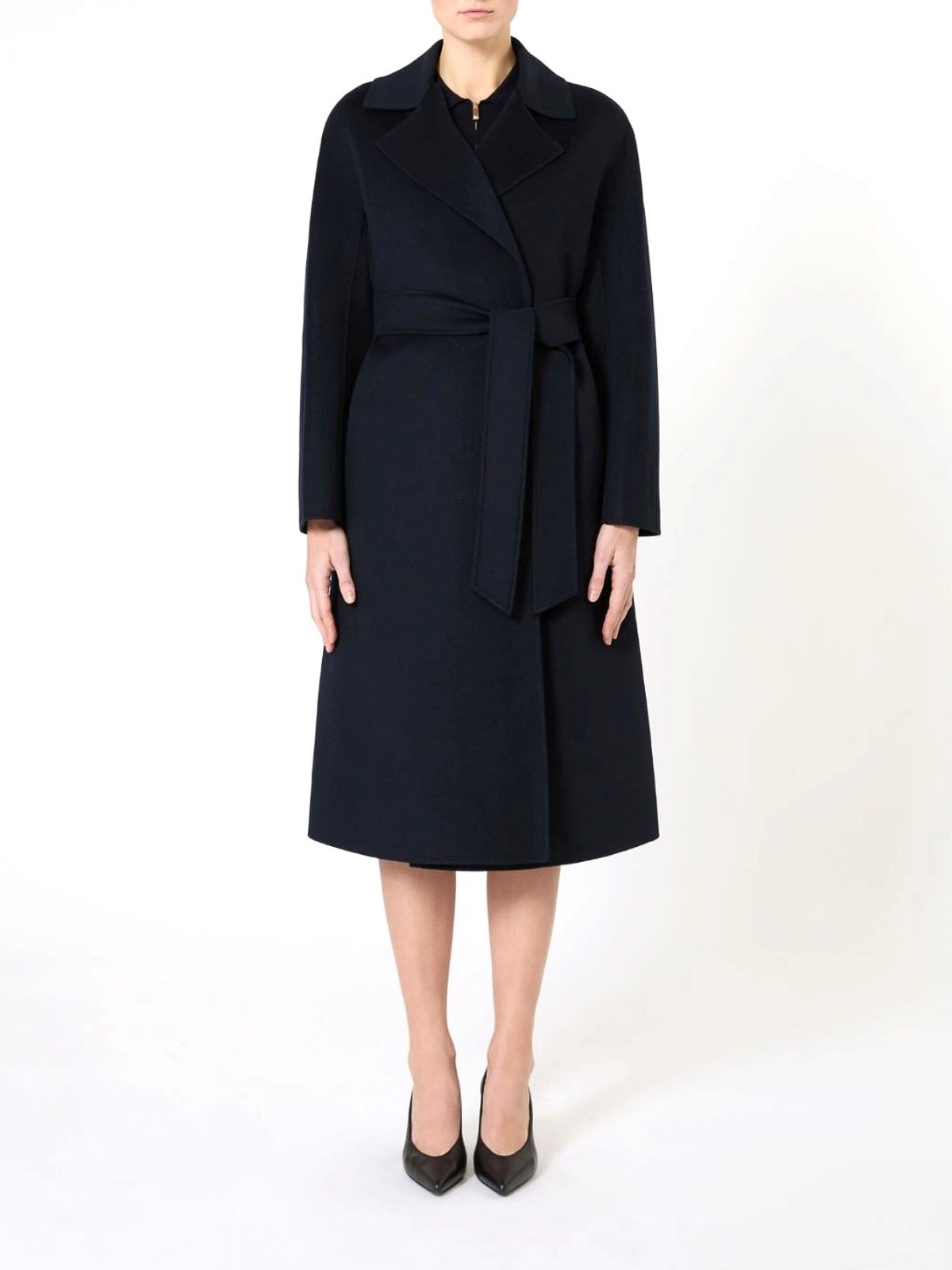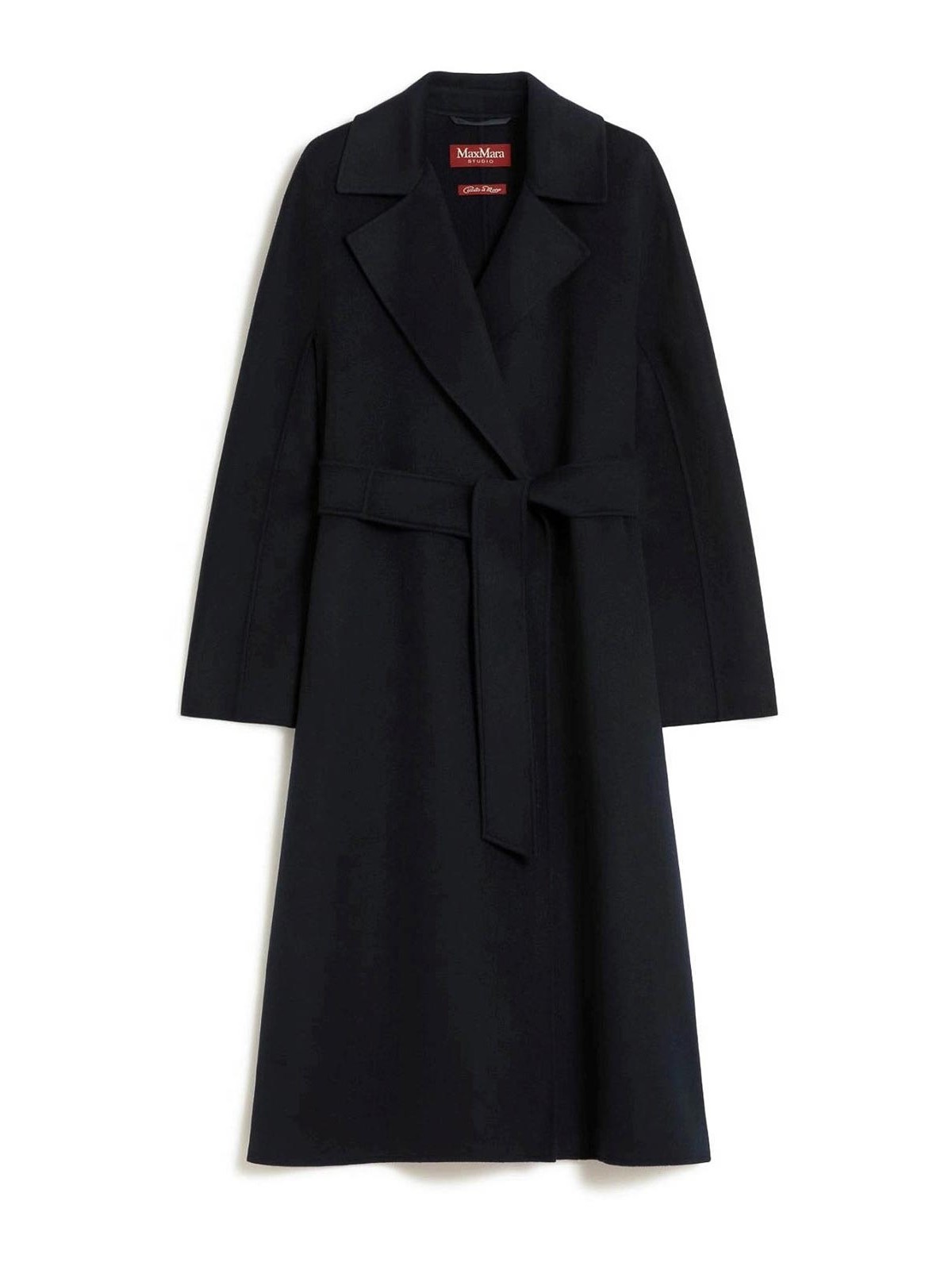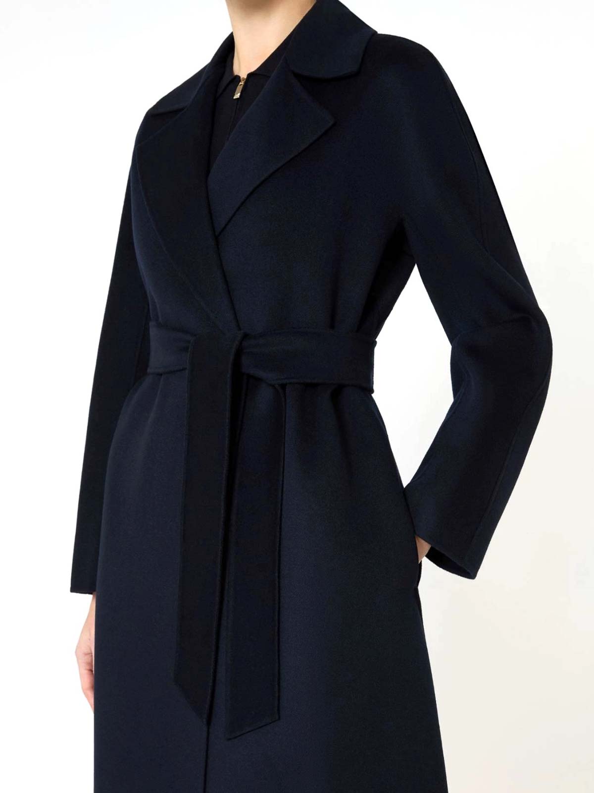 Abrigo de doble capa y corte envolvente, ligeramente acampanado en el dobladillo, cuello con solapa, mangas largas tipo kimono con cinturón a juego, bolsillos laterales insertados sin forro