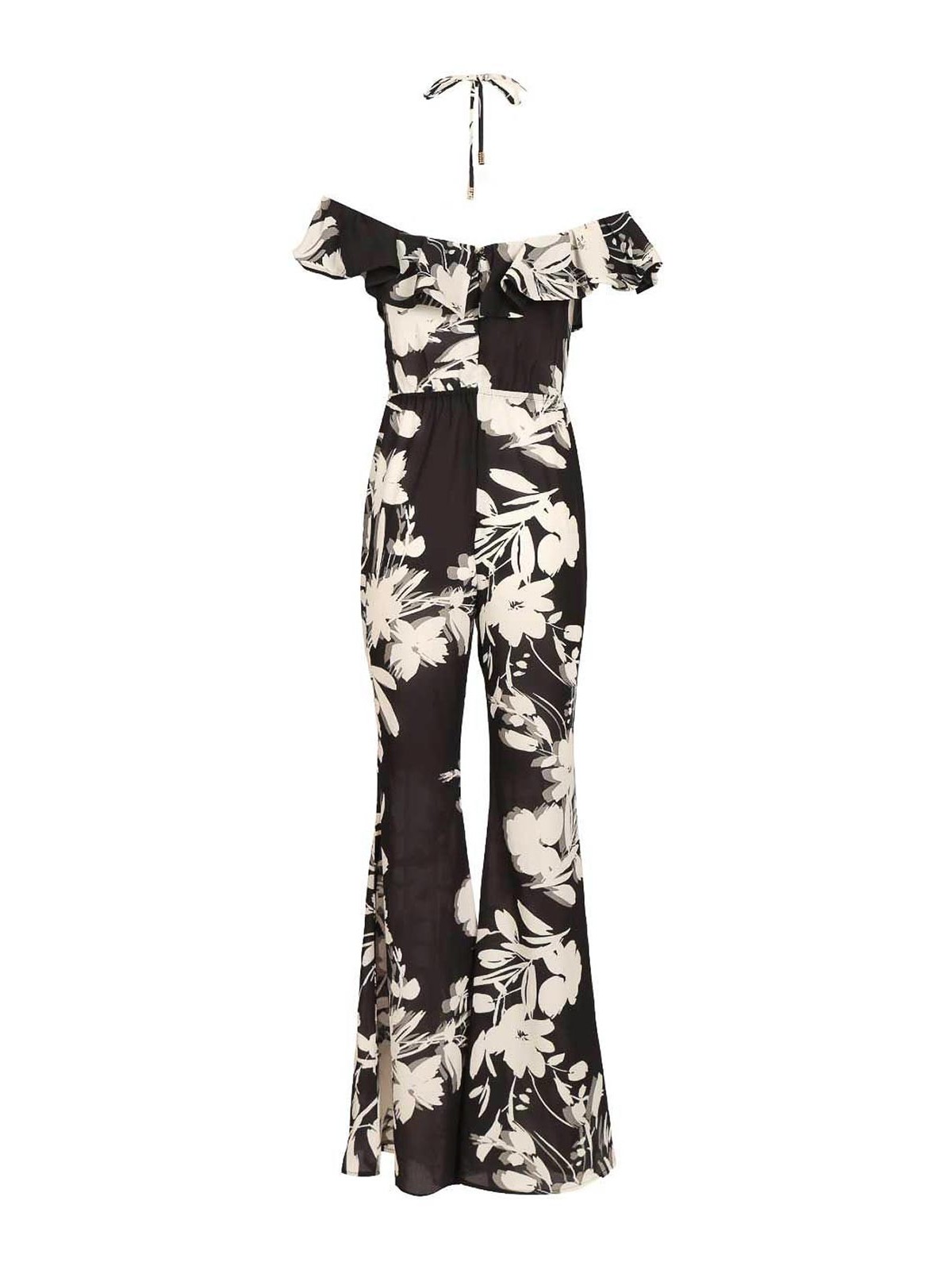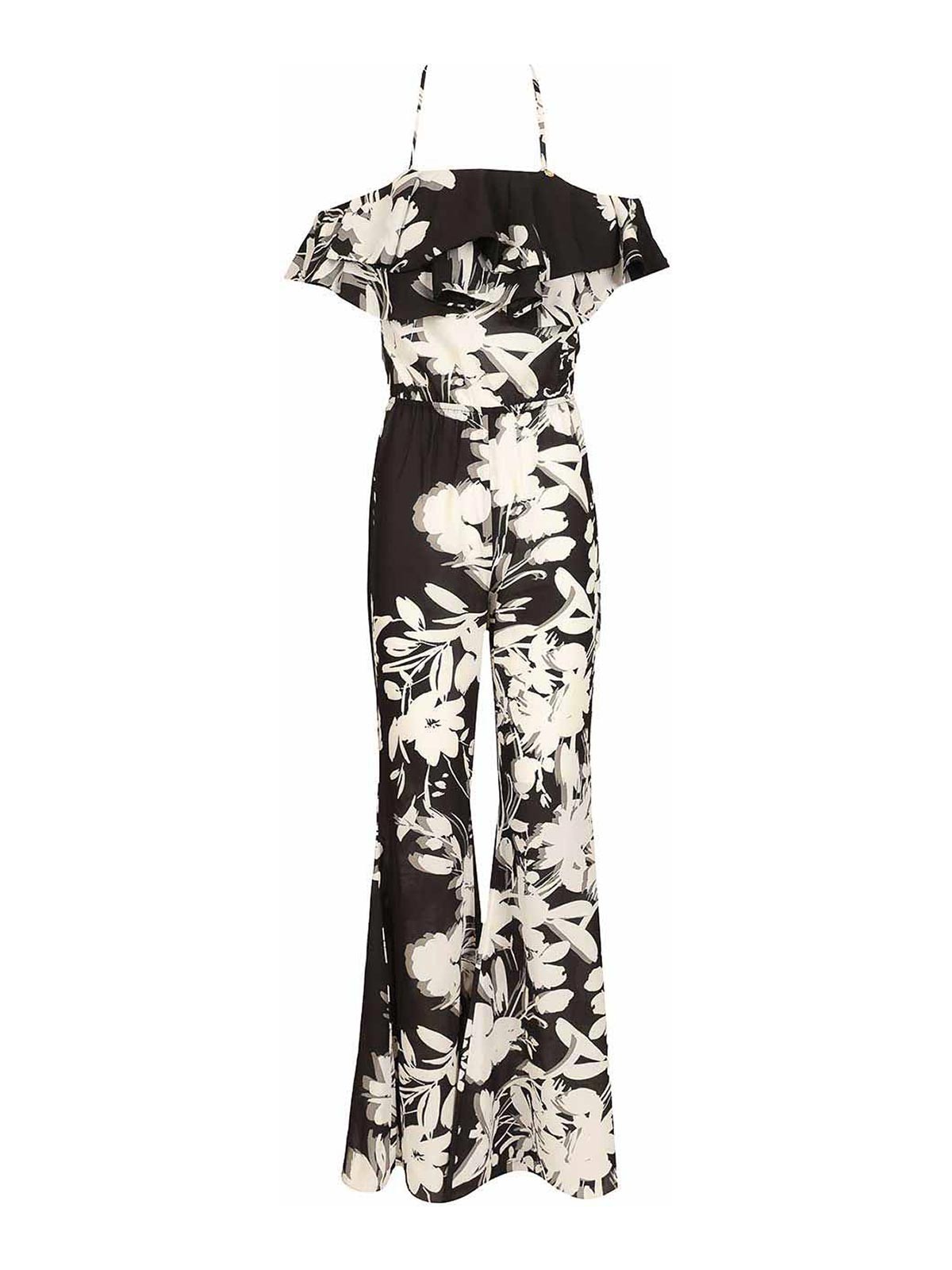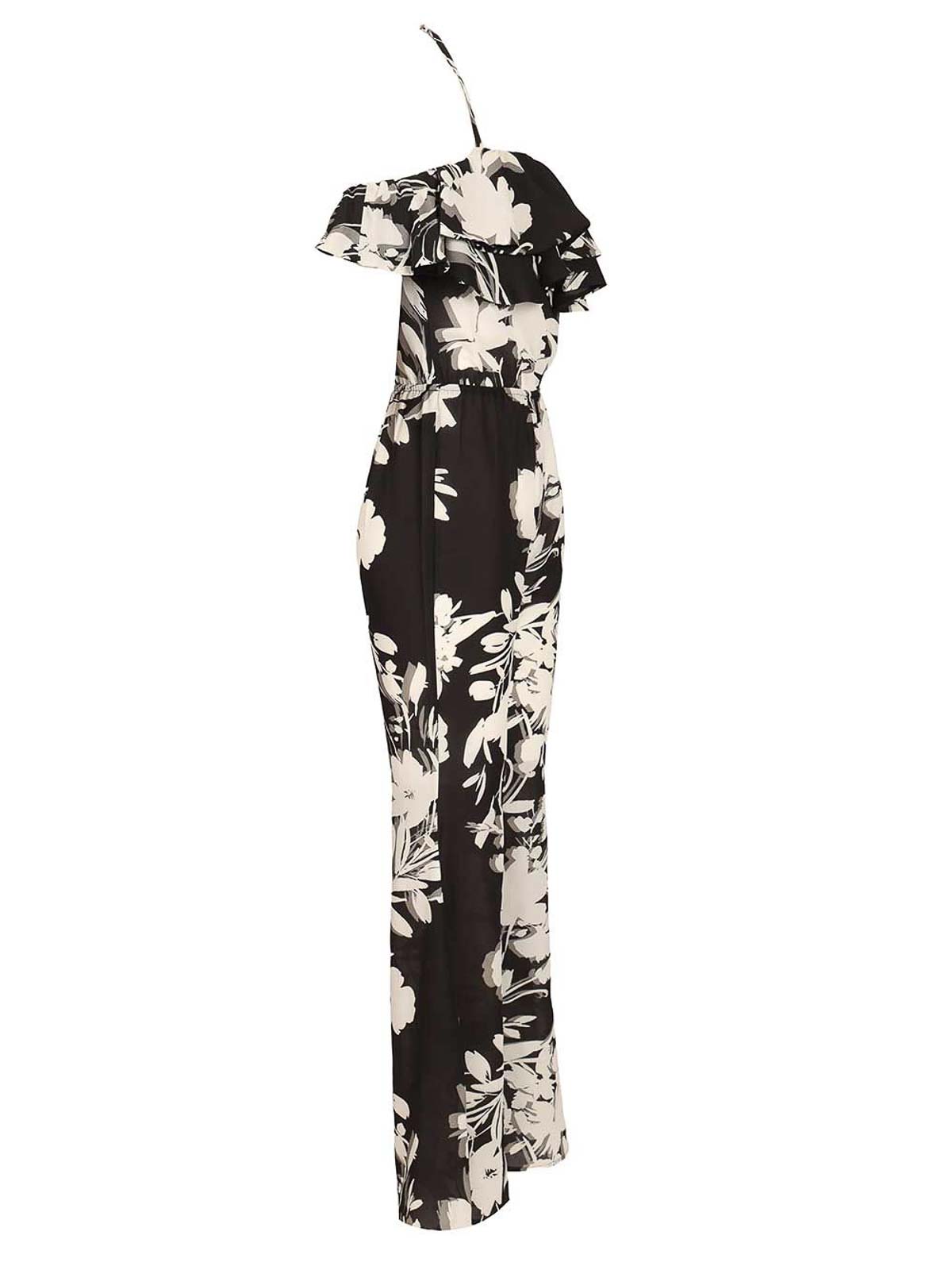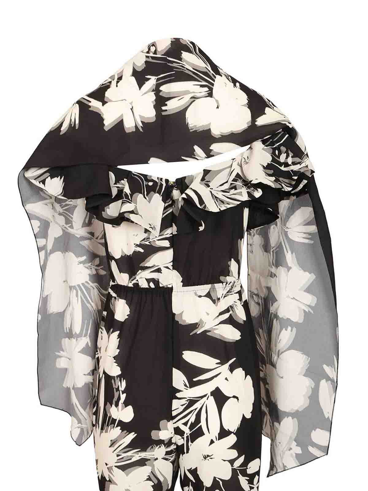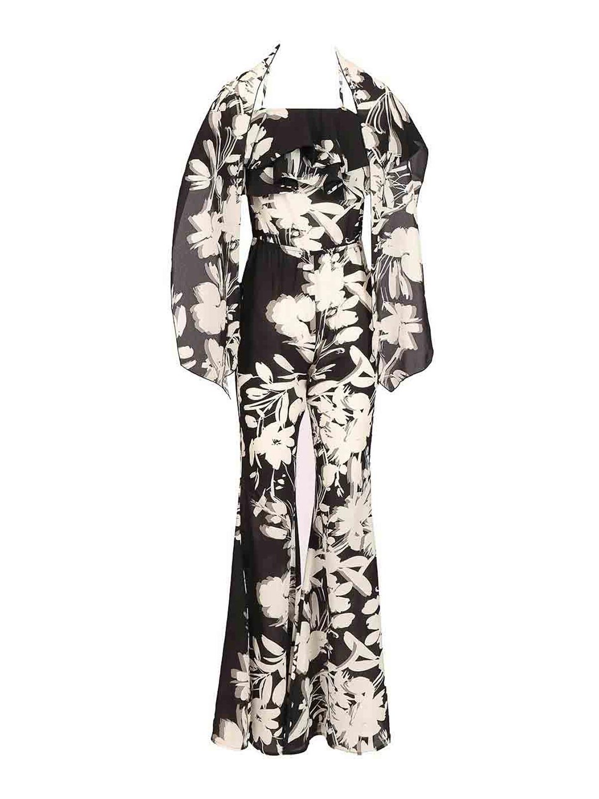 Mono largo en georgette de Catalina con cuello suave con estampado floral y pantalones anchos. La colocación del estampado en toda la superficie puede variar