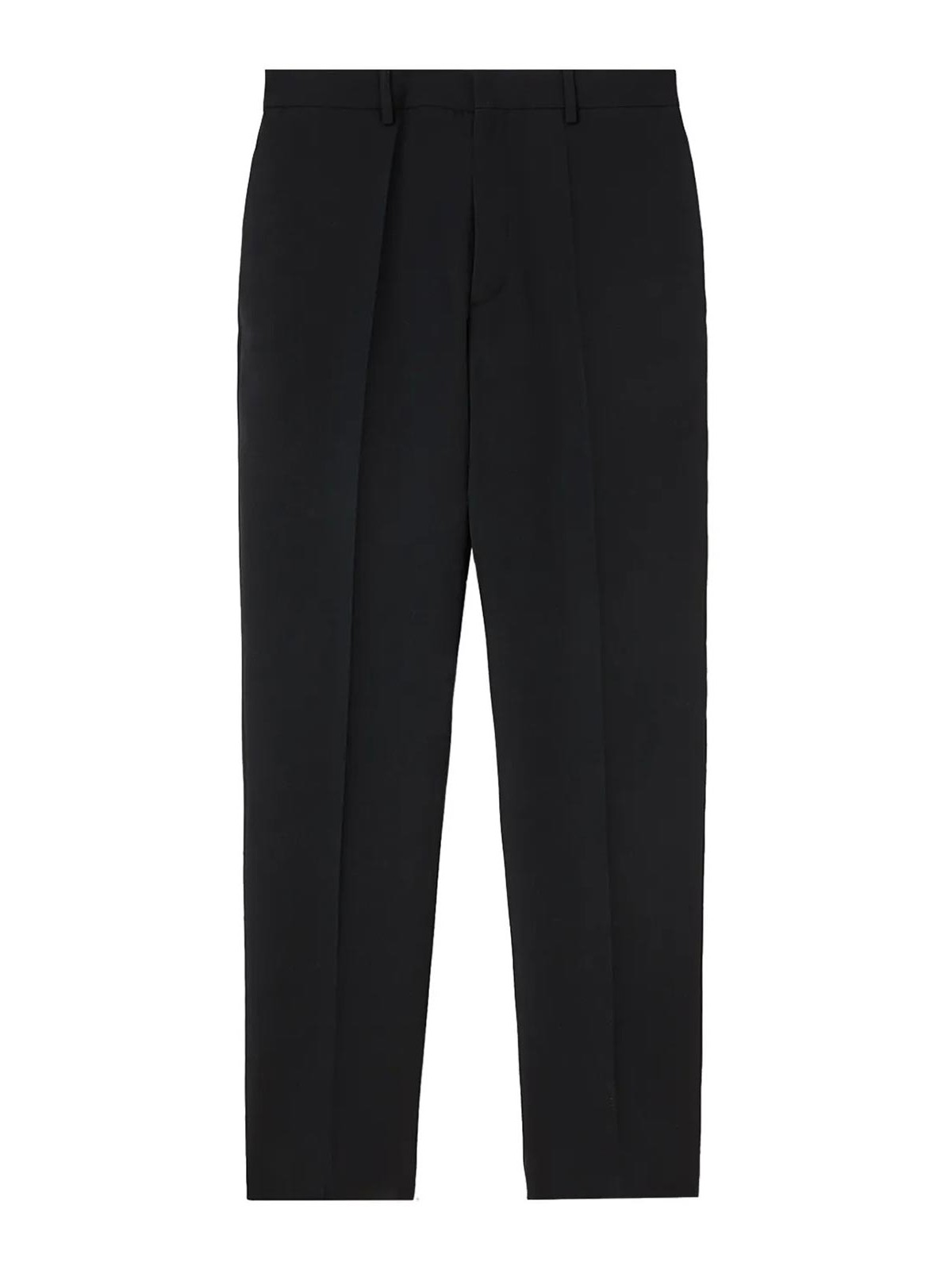 Detalles de pliegues de diseño en azul oscuro con pliegues planchados trabillas para cinturón, pernera cónica oculta, dos bolsillos laterales insertados, dos bolsillos ribeteados en la parte trasera