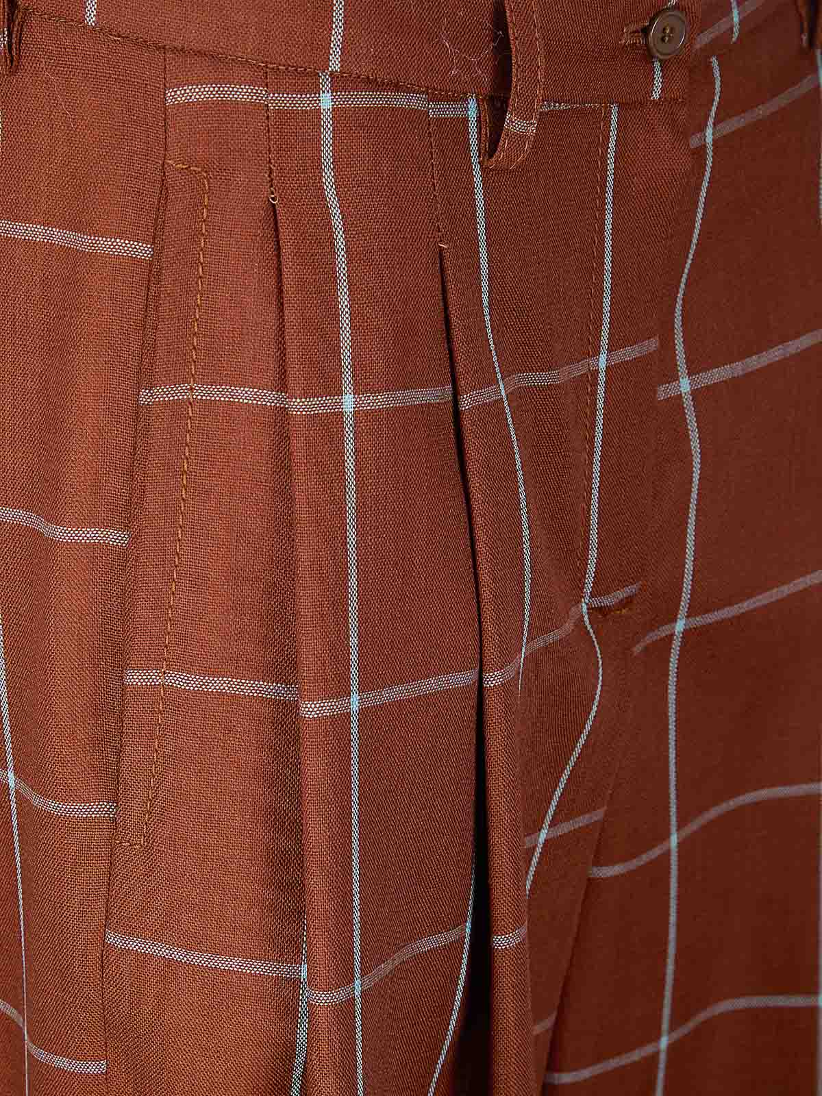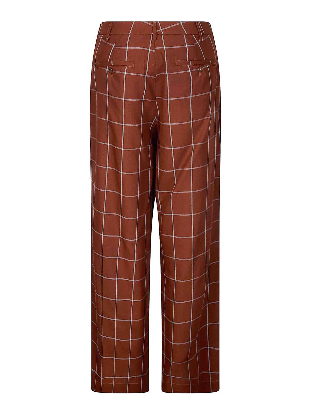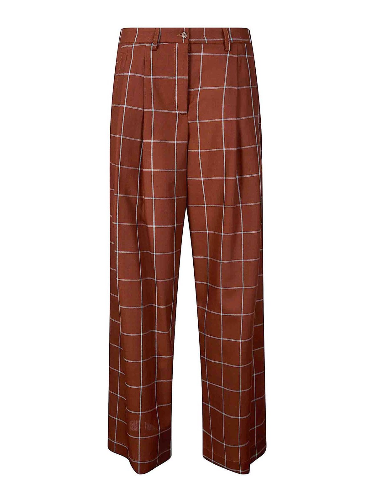Pantalones anchos con pliegues, bolsillos laterales, cierre con botón y cremallera.