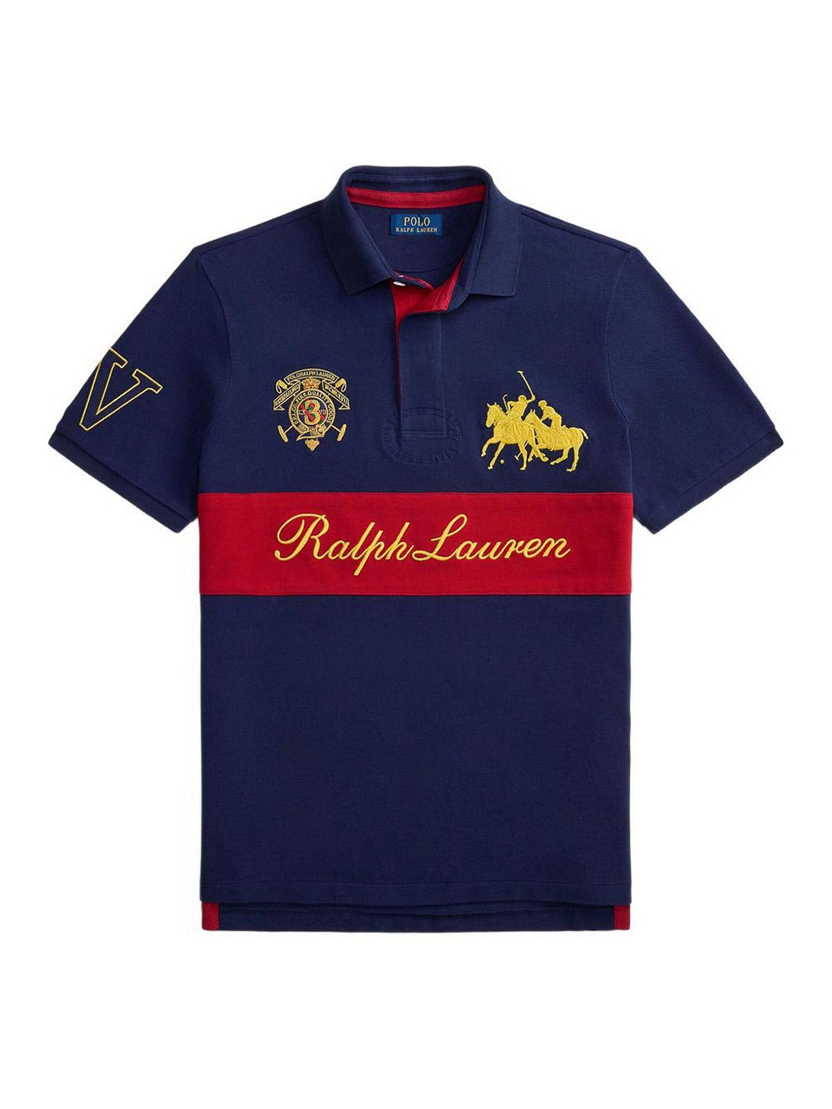 Polo Ralph Lauren en azul y rojo, con bordados, cuello clásico, mangas cortas y botones en la parte delantera. Hecho de algodón de alta calidad, ofrece comodidad y transpirabilidad para el uso diario. Su diseño atemporal lo hace perfecto para atuendos casuales refinados y looks deportivos pero refinados.