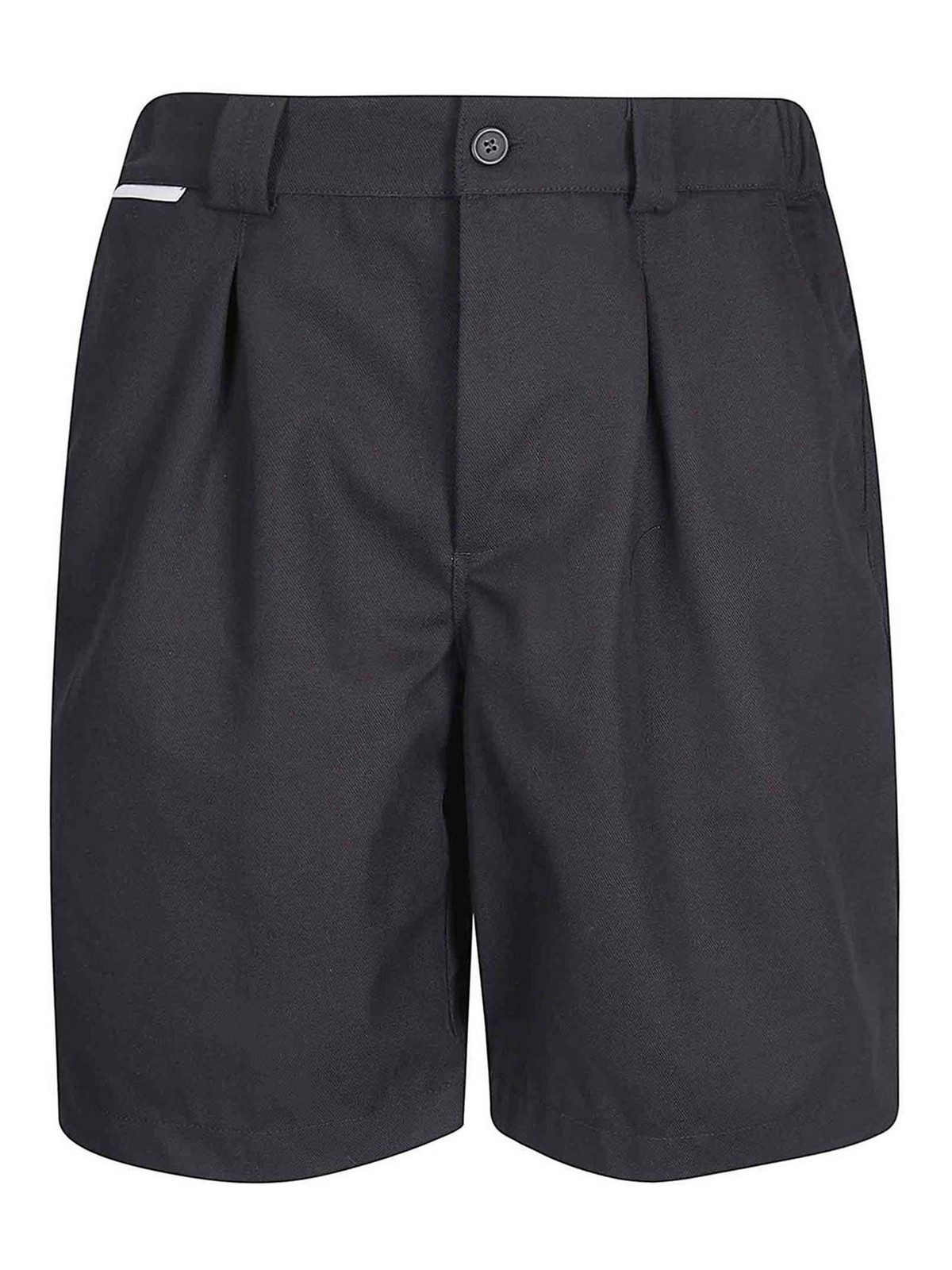 Pantalones cortos con pliegues en la parte delantera, trabillas para el cinturón, bolsillos traseros de parche y cierre con botones.