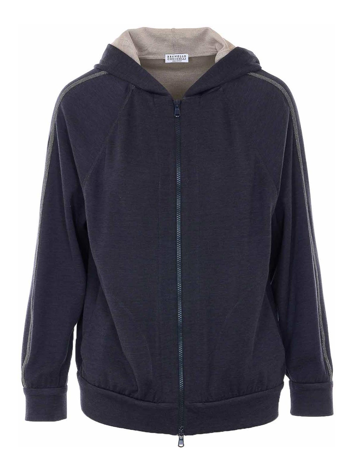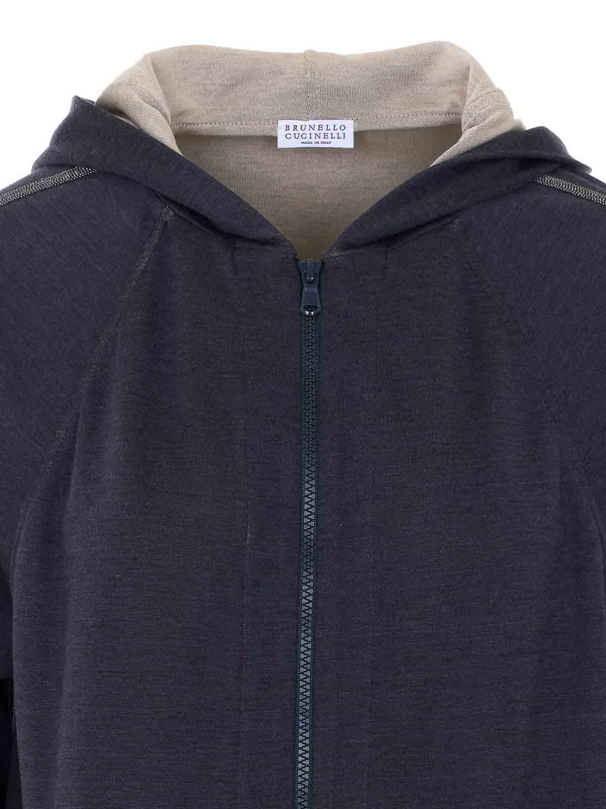 Sudadera Brunello cucinelli en carbono, capucha, cierre con cremallera en la parte delantera, bolsillos laterales, detalle del logotipo de Monile en la capucha