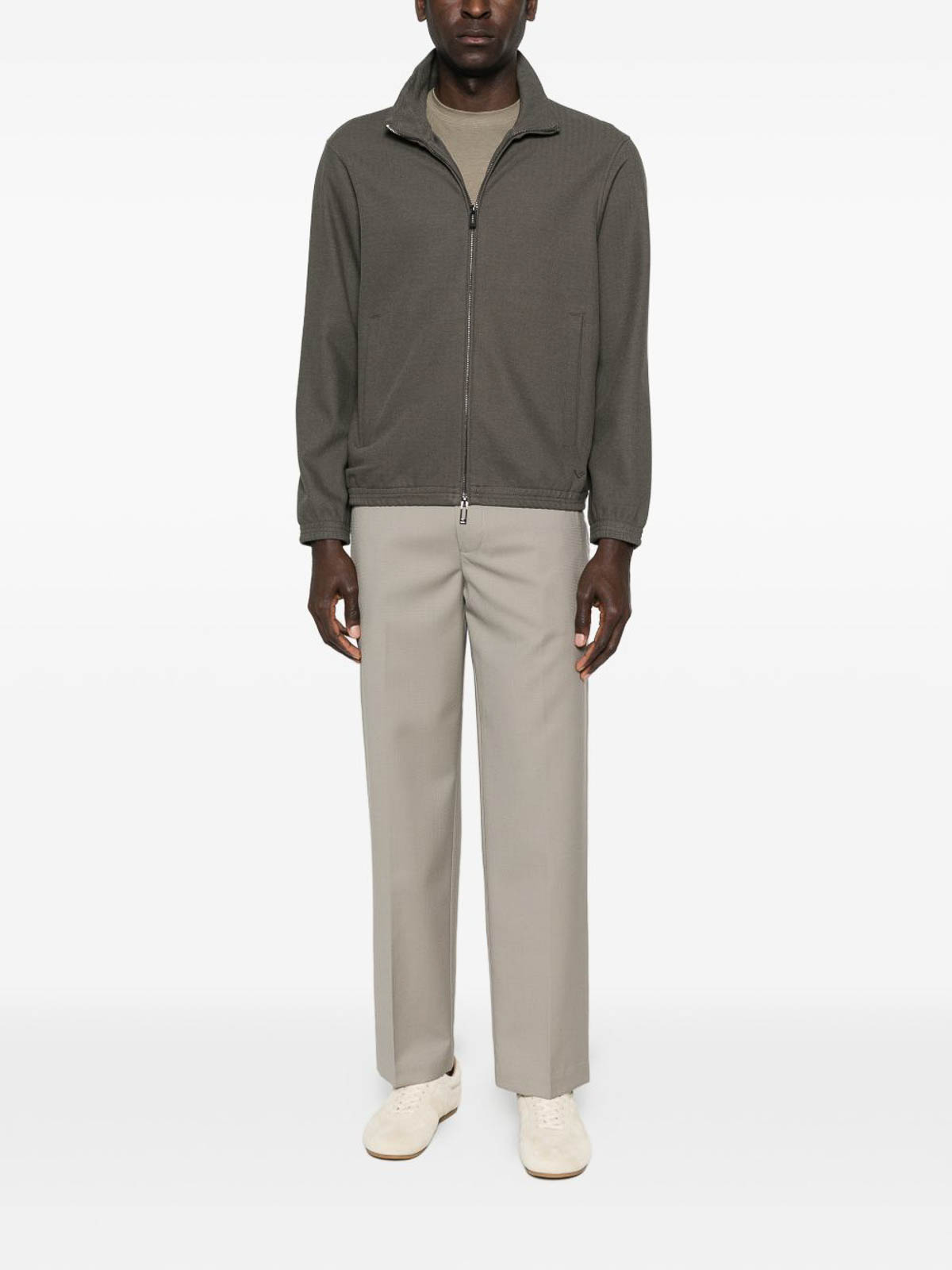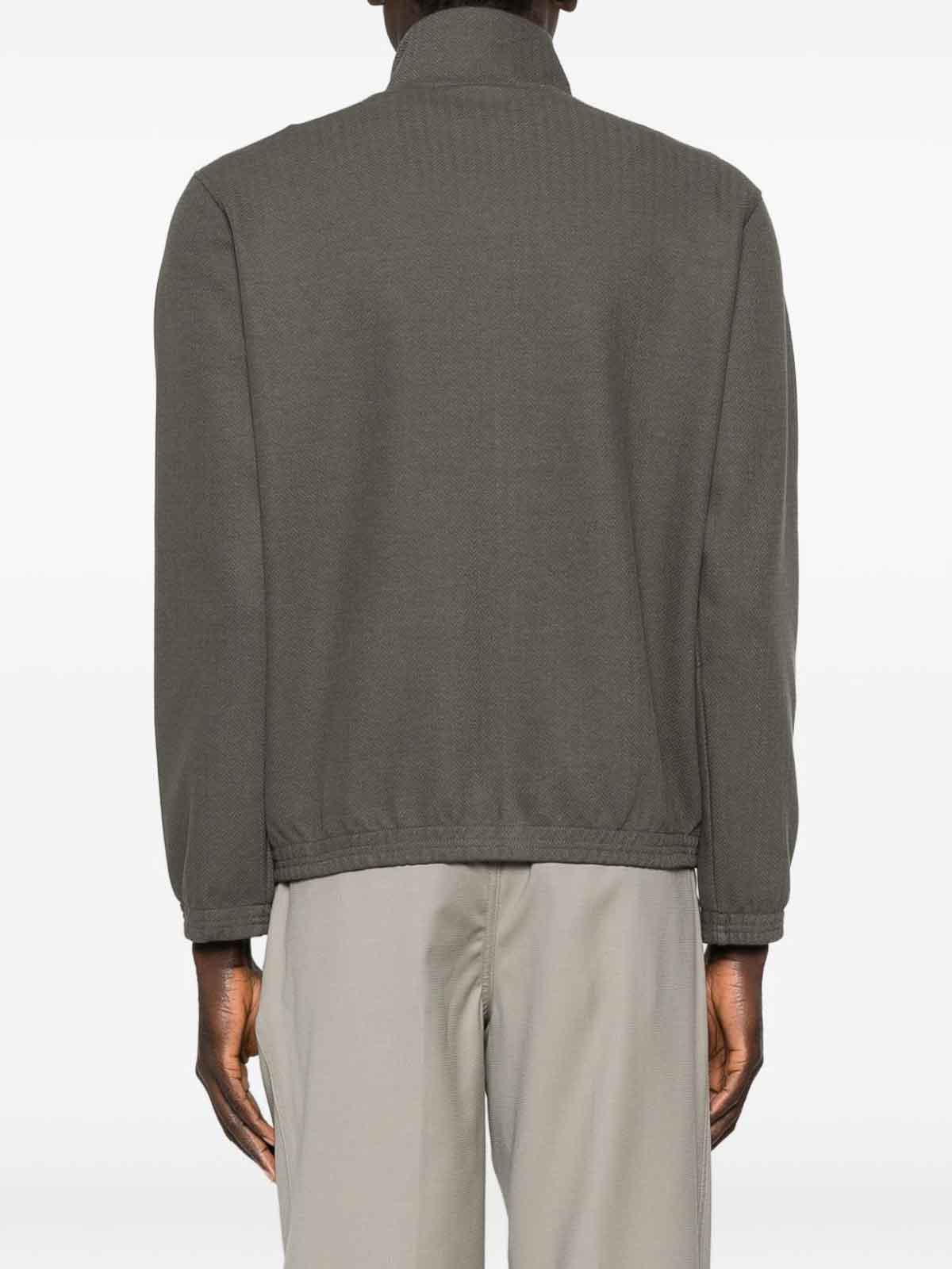 Cierre con cremallera gris, dos bolsillos frontales, cuello alto, mangas largas, dobladillo acanalado