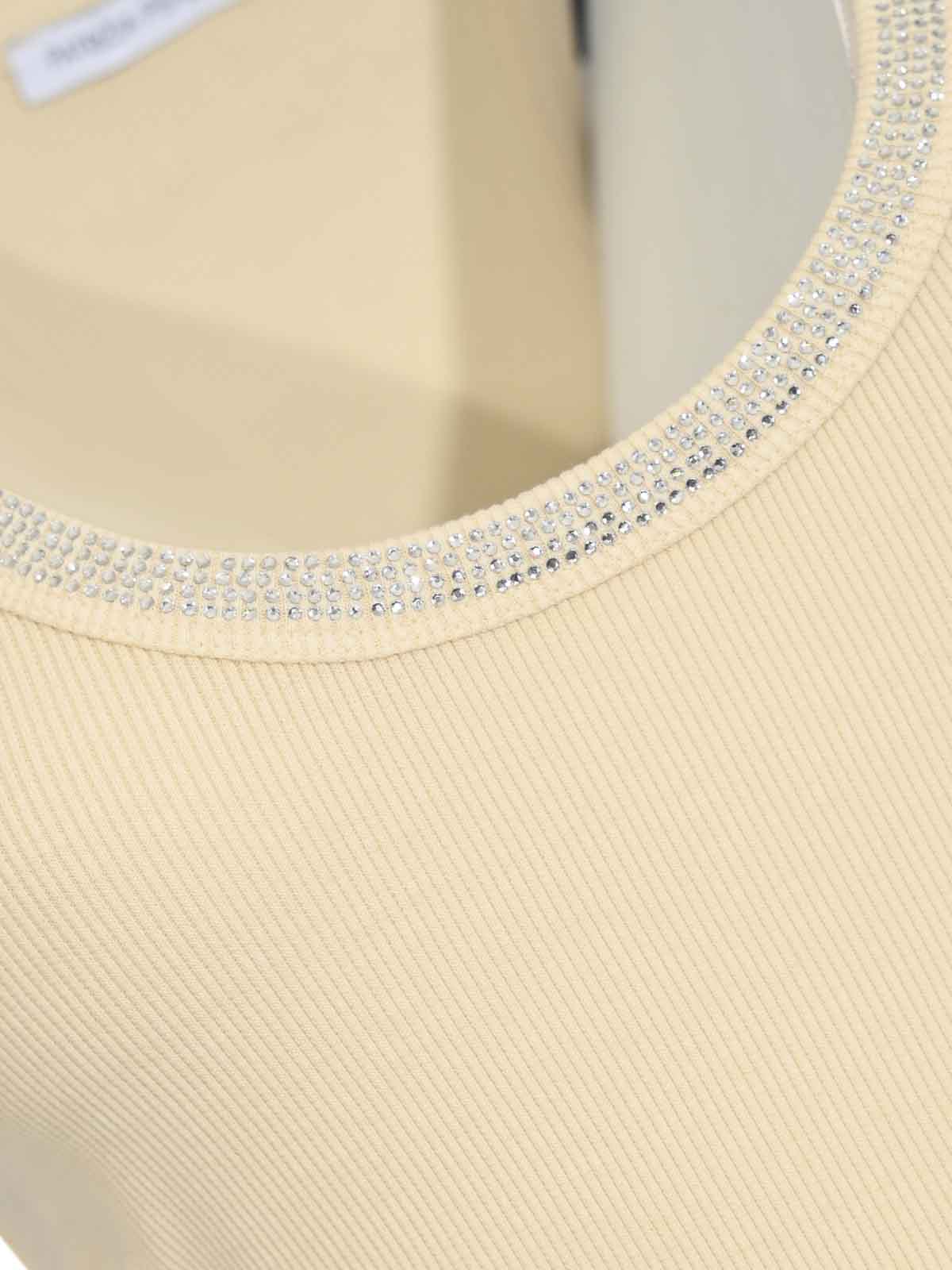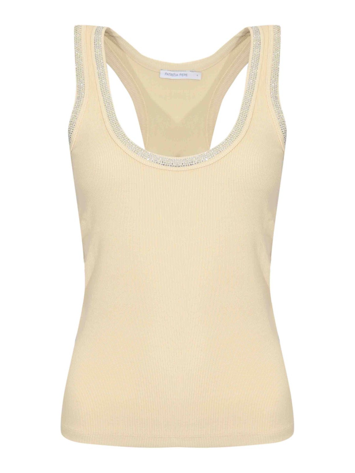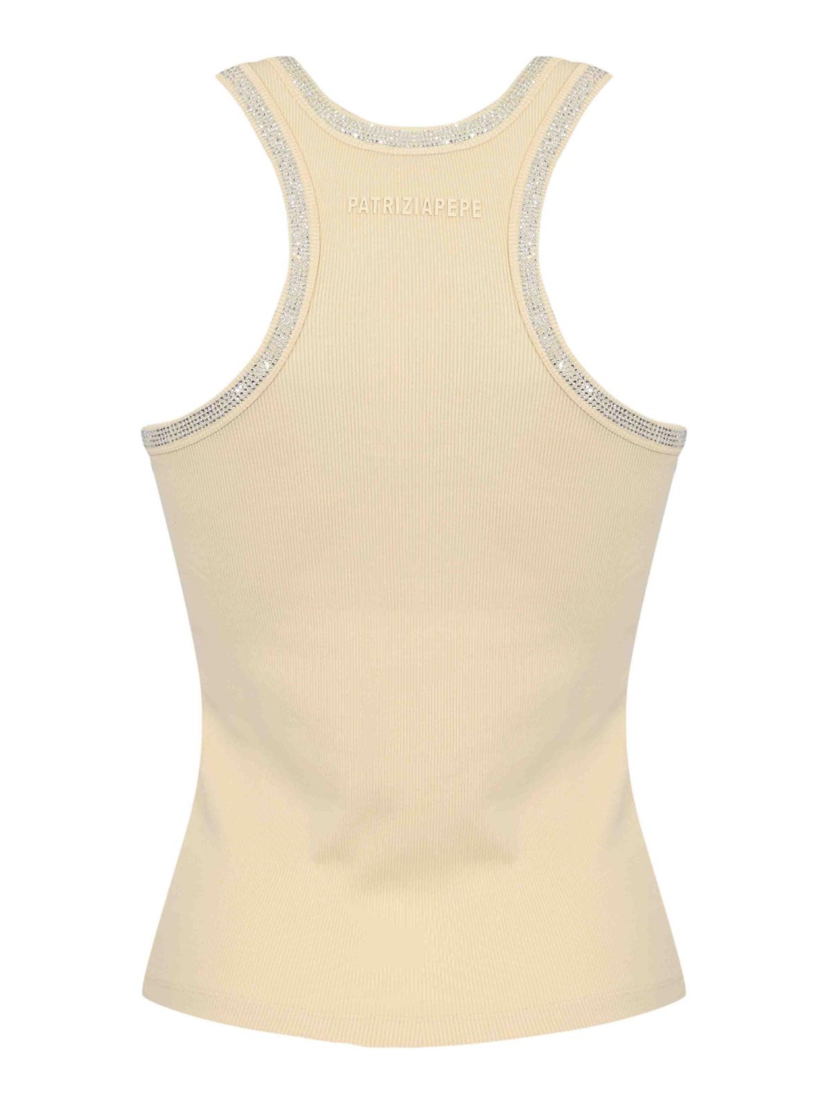Camiseta sin mangas de punto elástico para mujer, Patrizia Pepe, tejido: punto elástico acanalado, estampado: color liso, mangas: sin mangas, cuello: cuello: cuello redondo, cierre: ausente, bolsillos: ausentes, detalles: perfiles adornados con strass a lo largo del escote y las sisas, espalda deportiva con el logotipo de Patrizia Pepe, forro: no, corte: ajustado