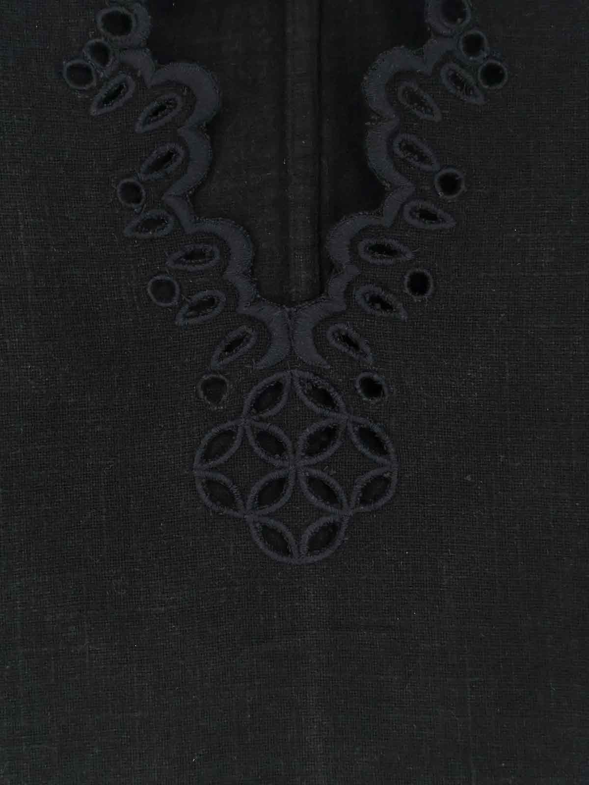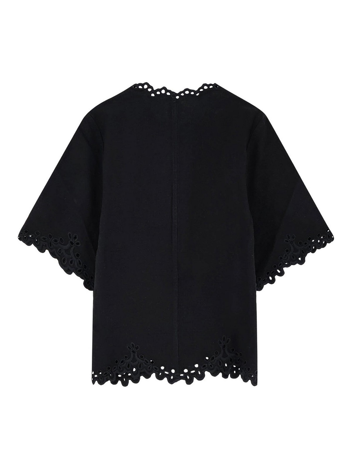 Escote en V, mangas cortas acampanadas, perfiles perforados, 100% algodón.