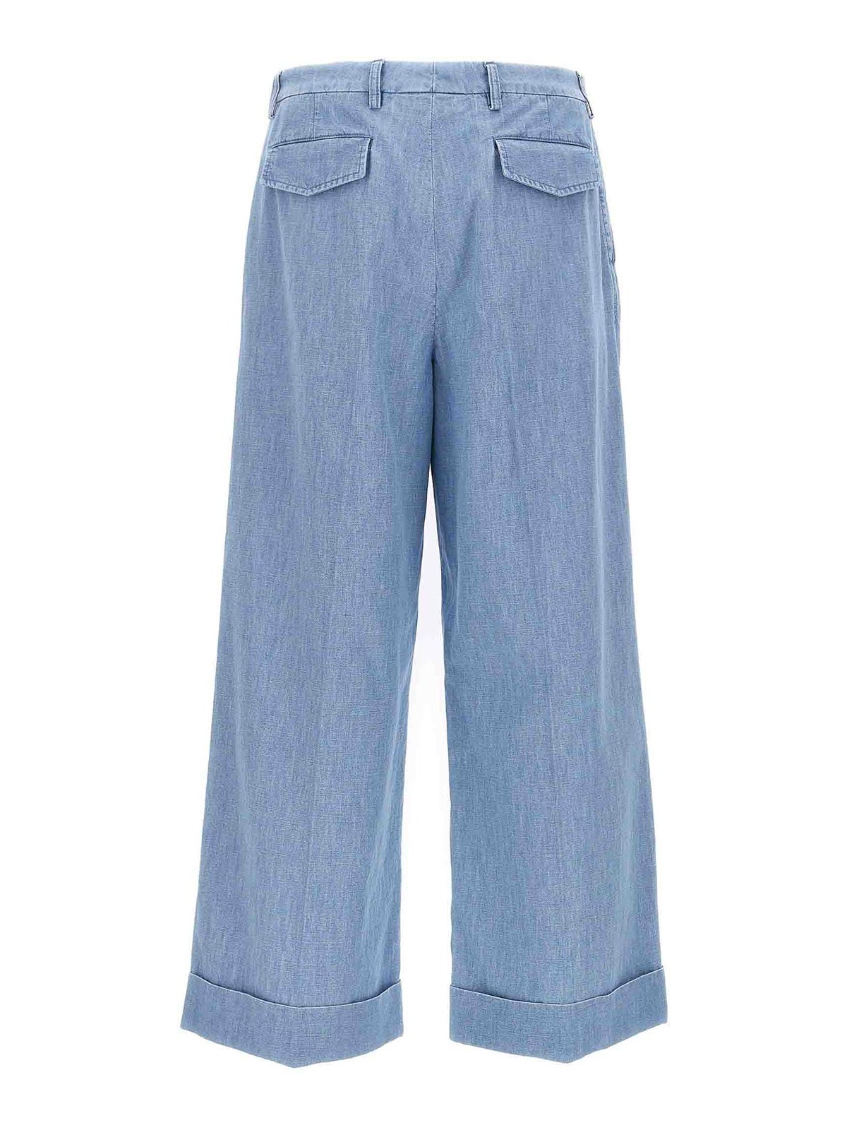 Vaqueros vaqueros de algodón de talle alto con cierre de cremallera con botones y ganchos, bolsillos, pernera ancha con pliegues estirados y dobladillo.