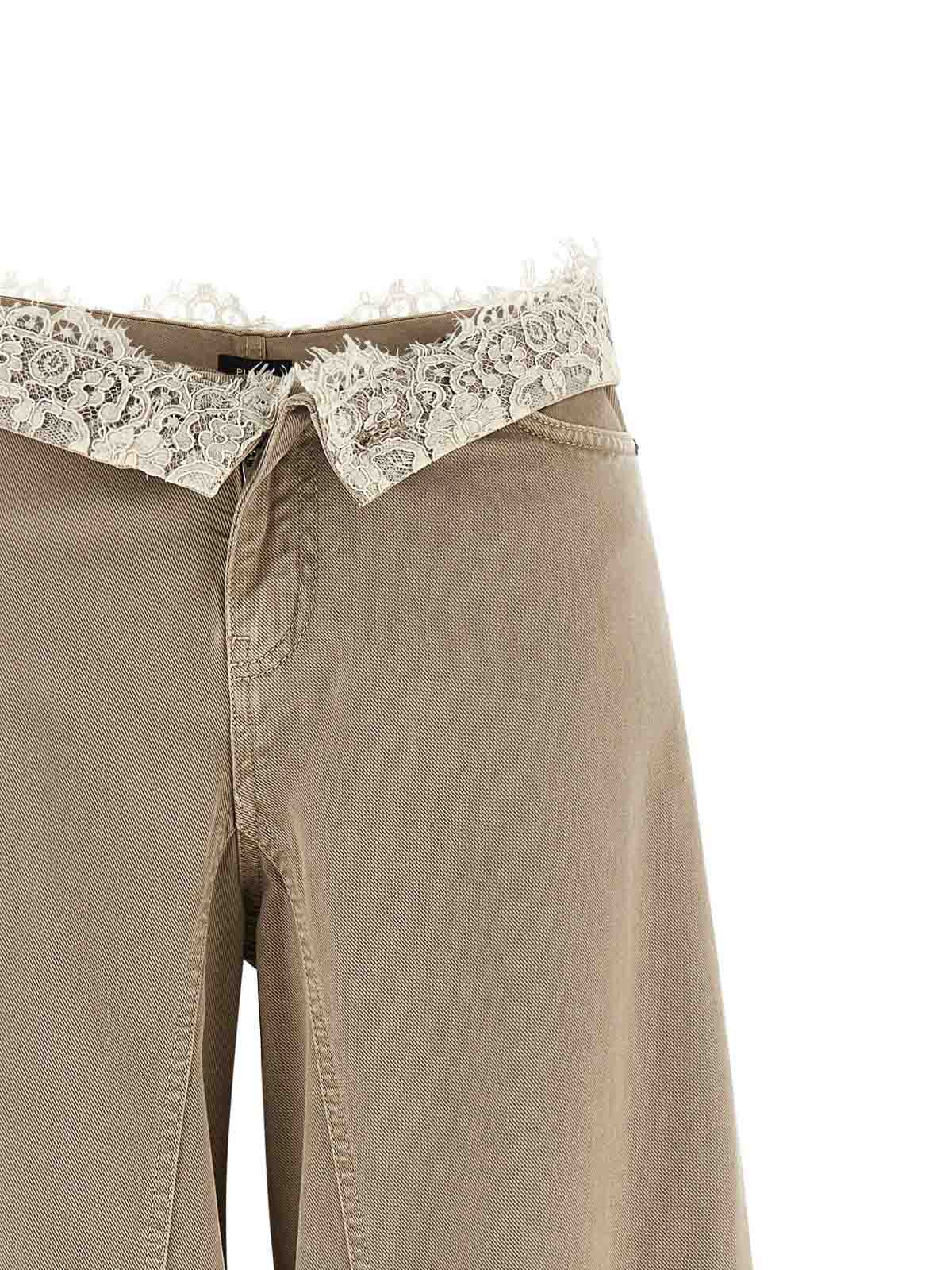 Vaqueros vaqueros de algodón con efecto descolorido de winona, pernera extra ancha, cintura con insertos de encaje en contraste, bolsillos, cierre con cremallera y botón a presión que permite llevar el modelo de dos maneras: cintura alta para un efecto monocromático o cintura doblada con encaje a la vista.