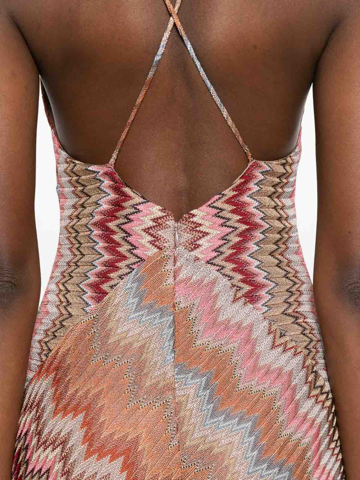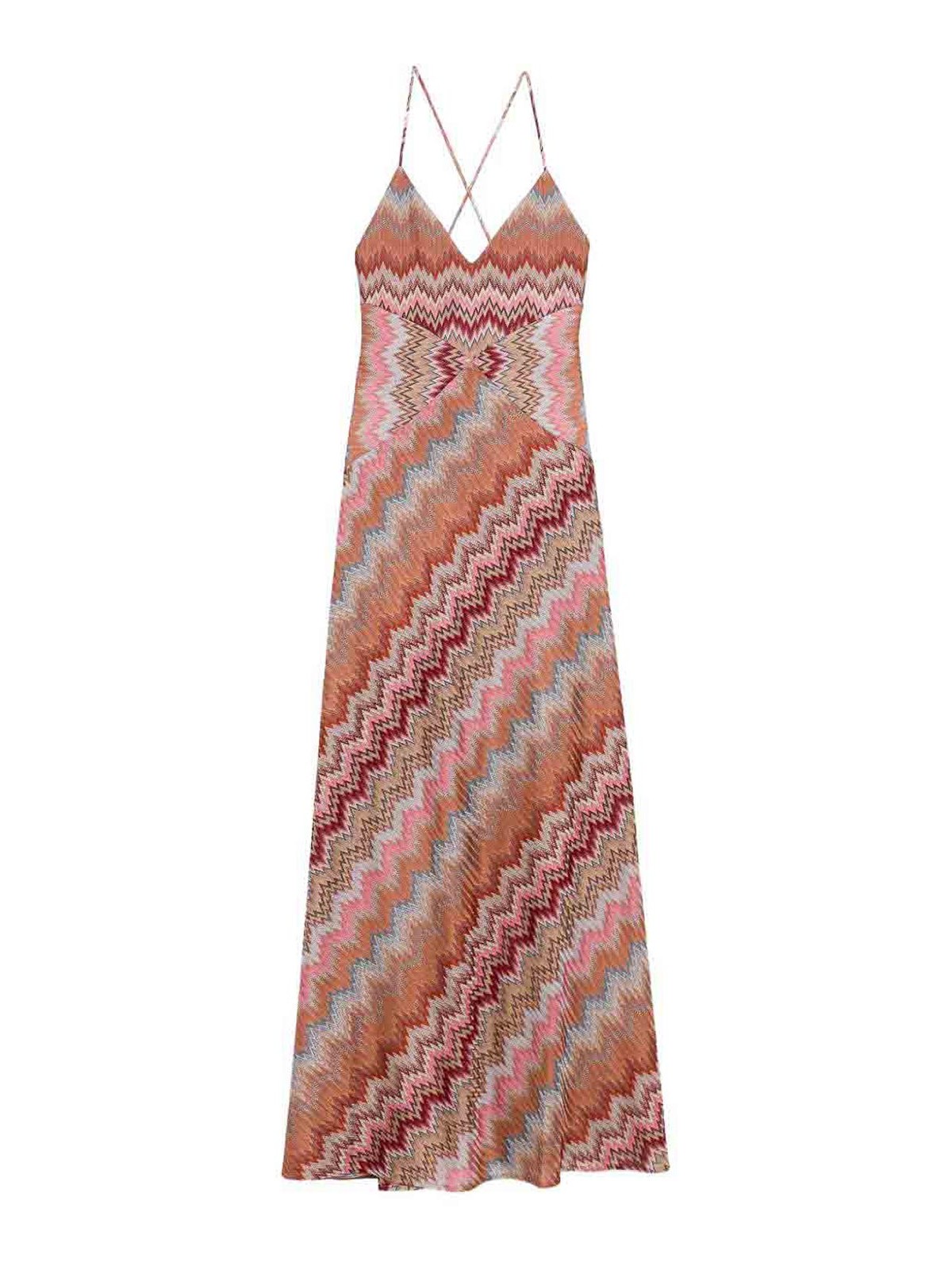 Vestido largo sin mangas en tonos rosa y óxido de Missoni, fabricado en Italia con icónica artesanía artesanal. Con un estampado en zigzag, tirantes, escote en V y longitud máxima, cada pieza puede diferir ligeramente de la imagen, lo que resalta el exclusivo proceso hecho a mano de Missoni. Perfecto para looks elegantes y llamativos.
