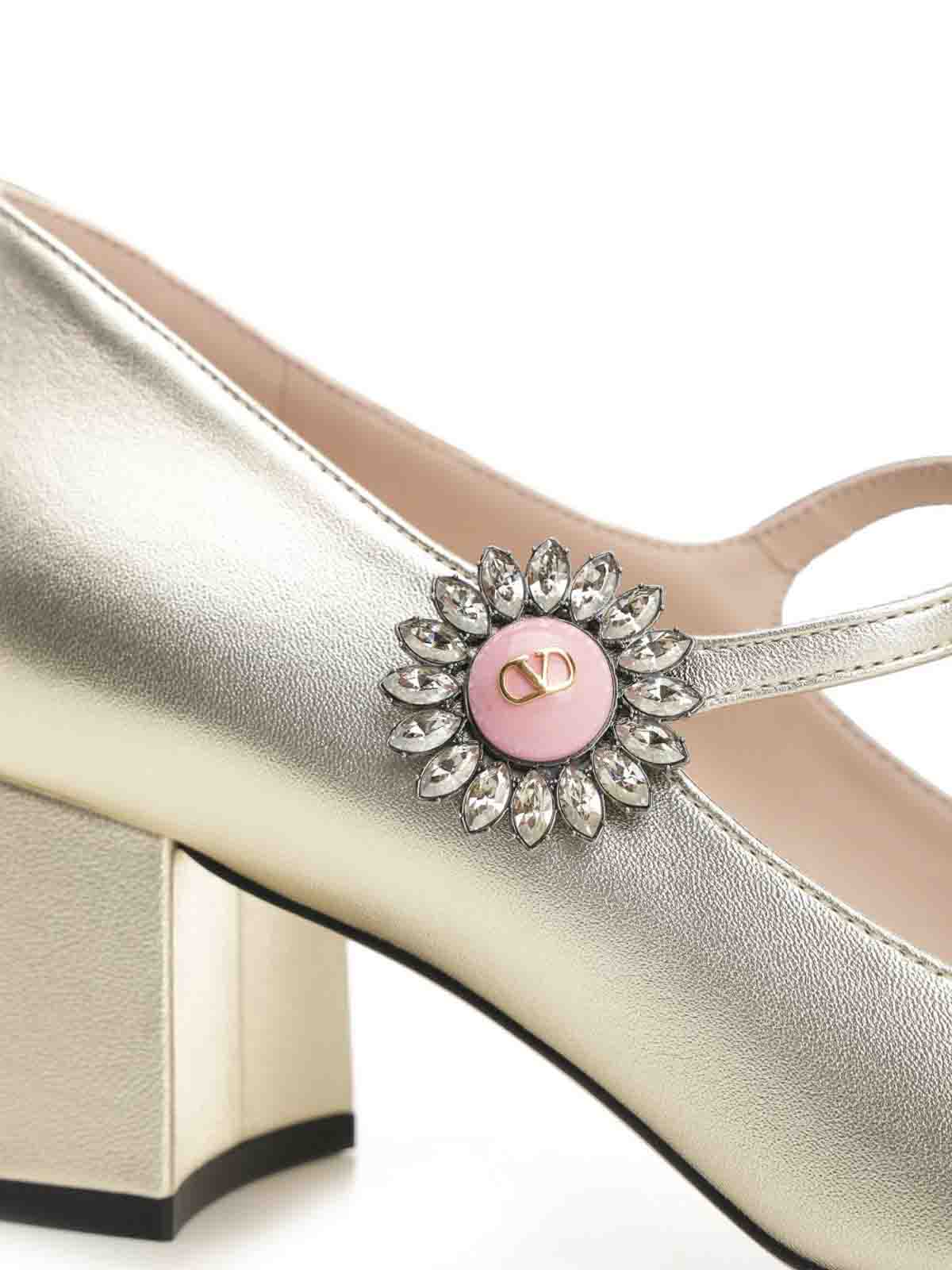 Mary Jane de piel de napa bañada en plata con una joya de margarita. Correa delgada con un botón tipo joya en forma de margarita adornado con cristales y esmalte rosa con un logotipo en V dorado.