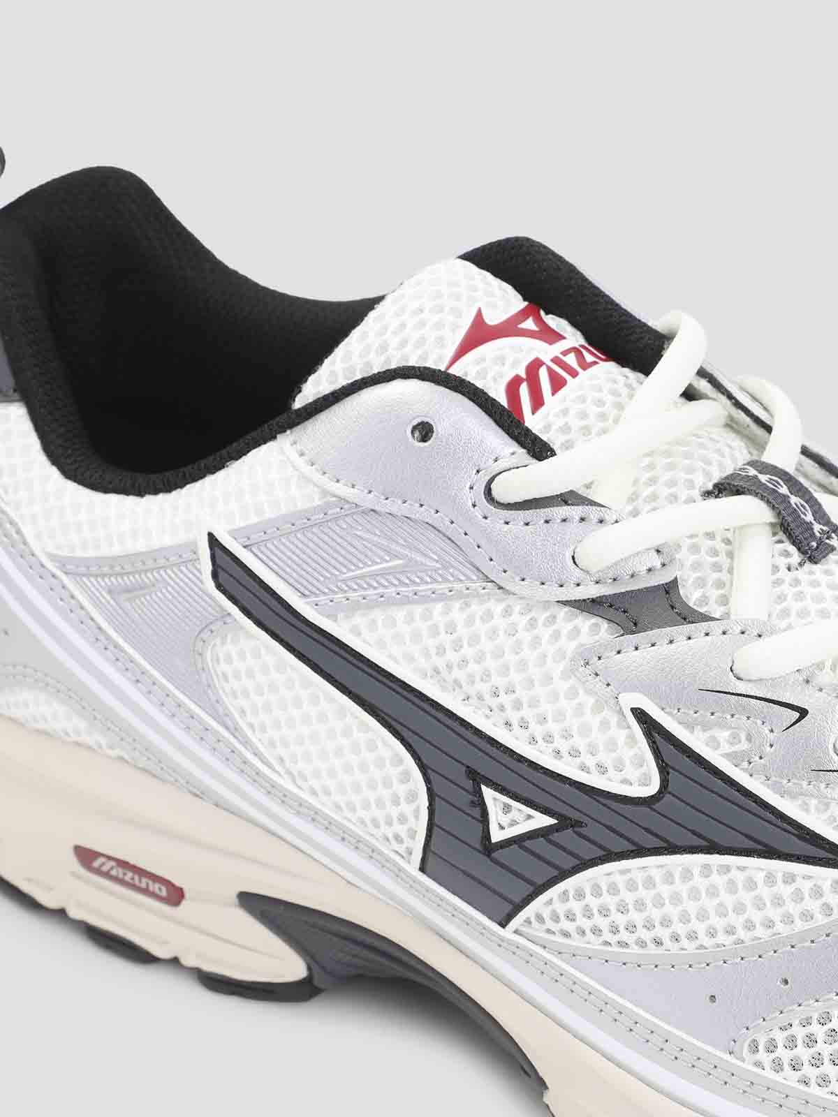 Sneakers de sport MXR en cuir blanc Mizuno. Confectionnées en cuir et maille. bout rond, fermeture à lacets blancs sur le dessus, fermeture à lacets en fer blanc, logo gris sur le dessus, logo gris en cuir sur le côté, détails blancs discrets en cuir, bride arrière ton sur ton. Semelle en caoutchouc blanc.