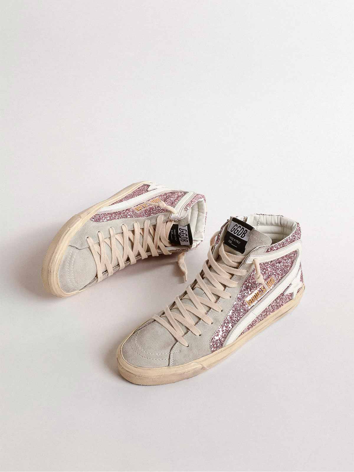 Baskets en cuir à paillettes roses, détails en cuir vieilli blanc, détails en daim contrastant, lacets épais.