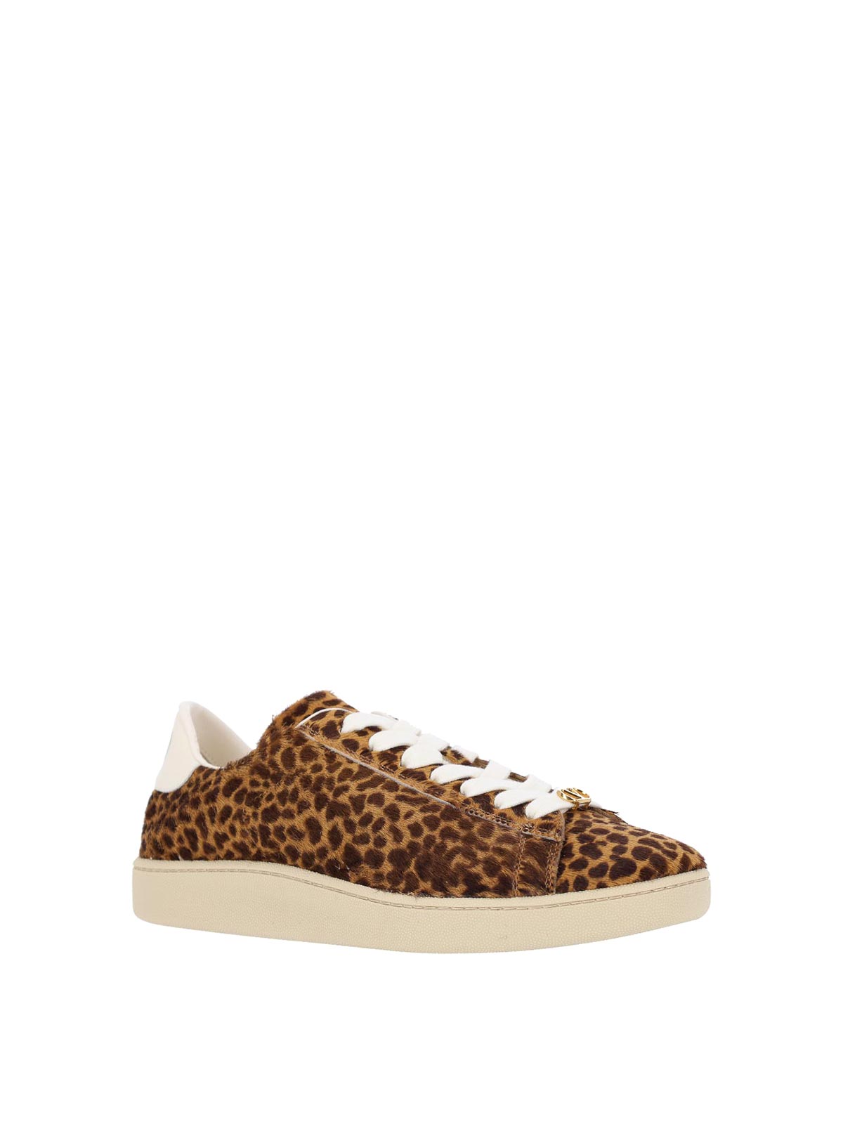 Baskets basses Royco Valentino Garavani en cuir marron, motif animalier, bout rond, fermeture à lacets, languette arrière contrastante, breloque logo en métal doré sur le devant, semelle en caoutchouc.