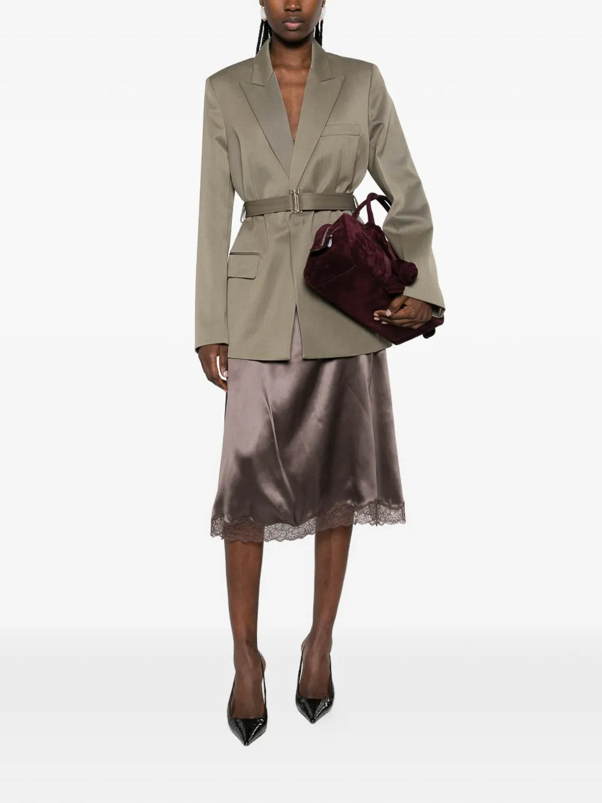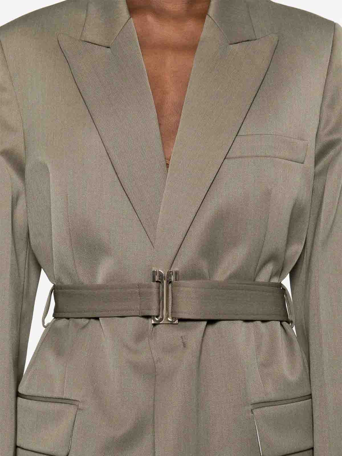 Logo de marque : vert sauge mélangé, revers crantés, poche passepoilée sur la poitrine, poches à rabat latérales, taille ceinturée