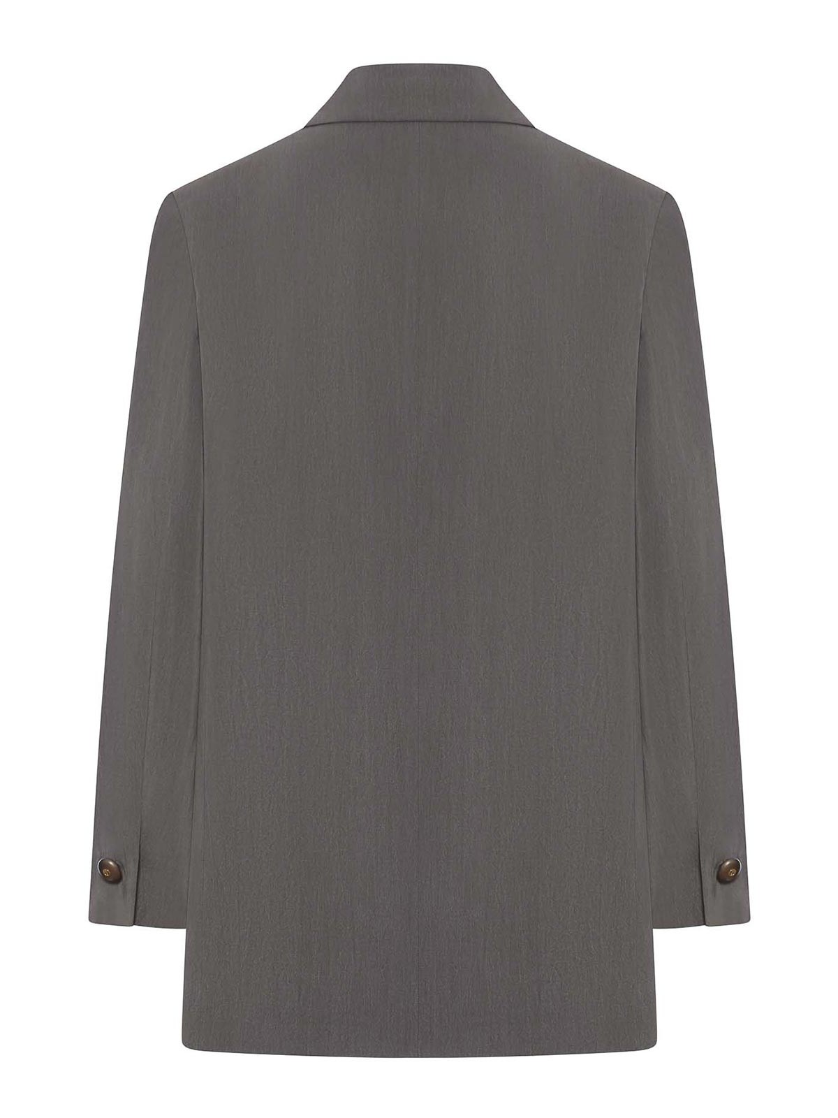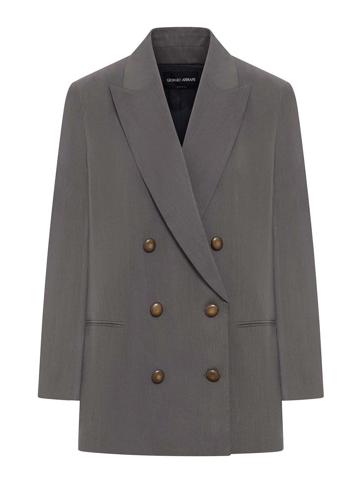 blazer à double boutonnage, revers crantés, fermeture avant par six boutons contrastants, tissu fluide légèrement texturé, poches latérales passepoilées discrètes, épaules régulières, manches longues boutonnées, coupe classique avec structure décontractée, soie mélangée, couleur : verre volcanique