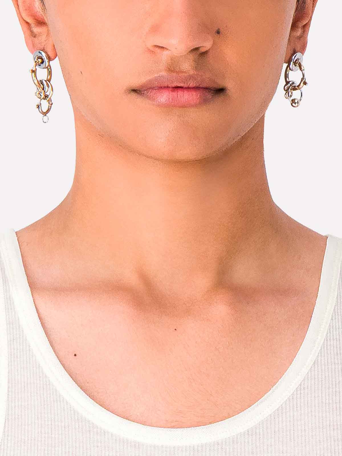 Paire de boucles d'oreilles asymétriques en argent et or, fermeture papillon, avec créoles.