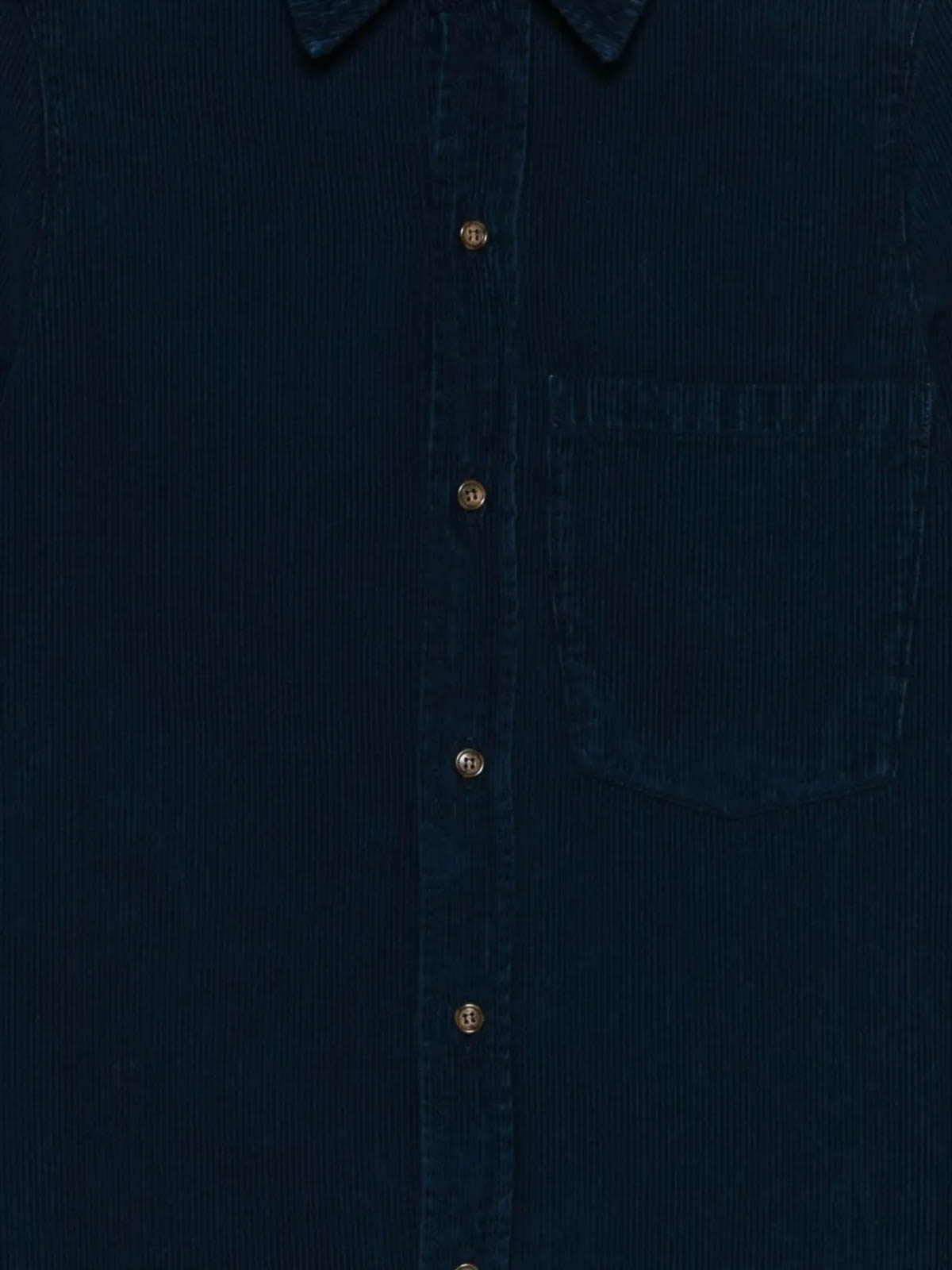 Vêtement de créateur, poche poitrine boutonnée en bleu, manches longues, texture en velours côtelé, col classique