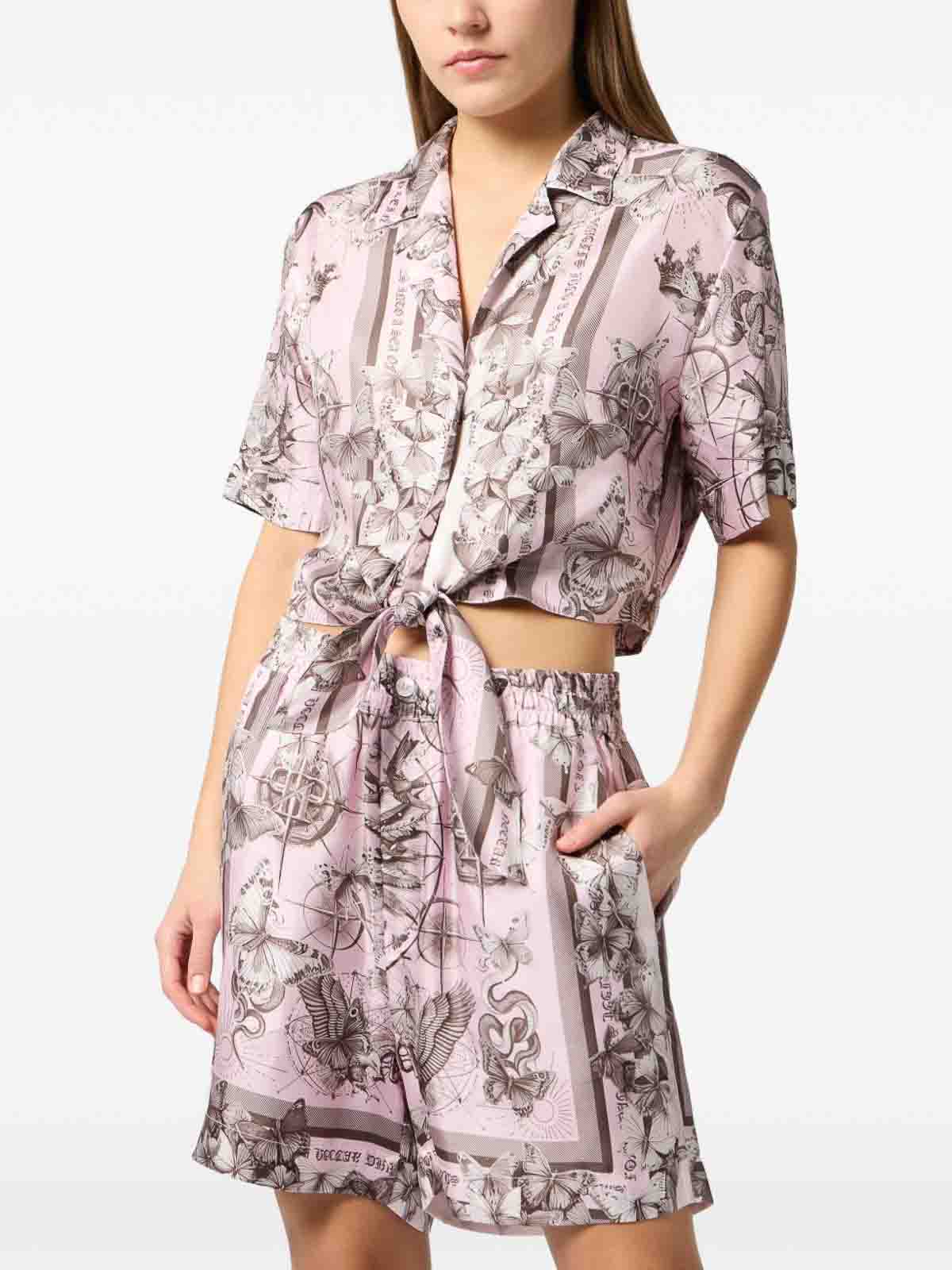 Chemise courte avec imprimé de papillons, cravate, manches courtes, modèle court, imprimé intégral