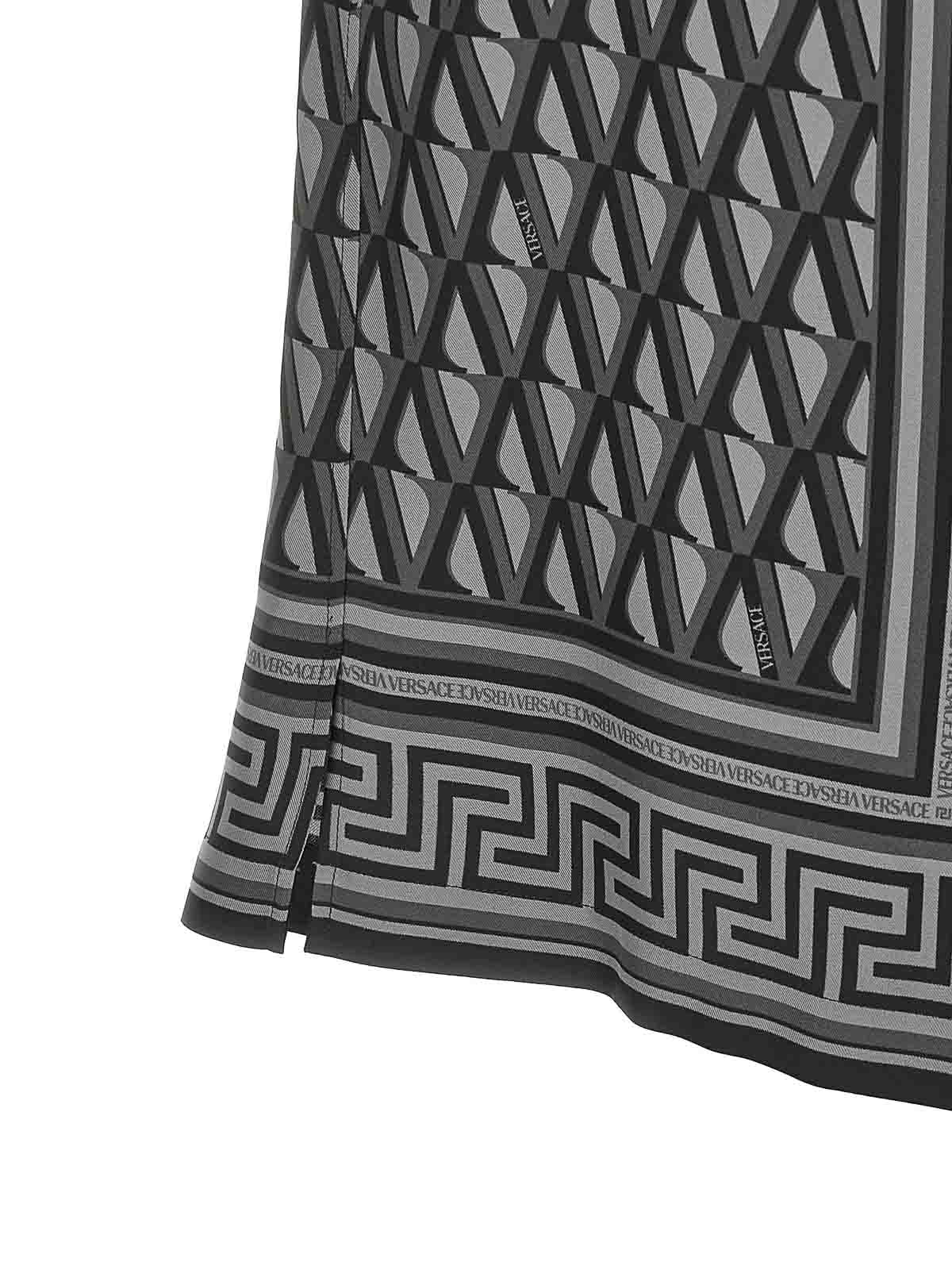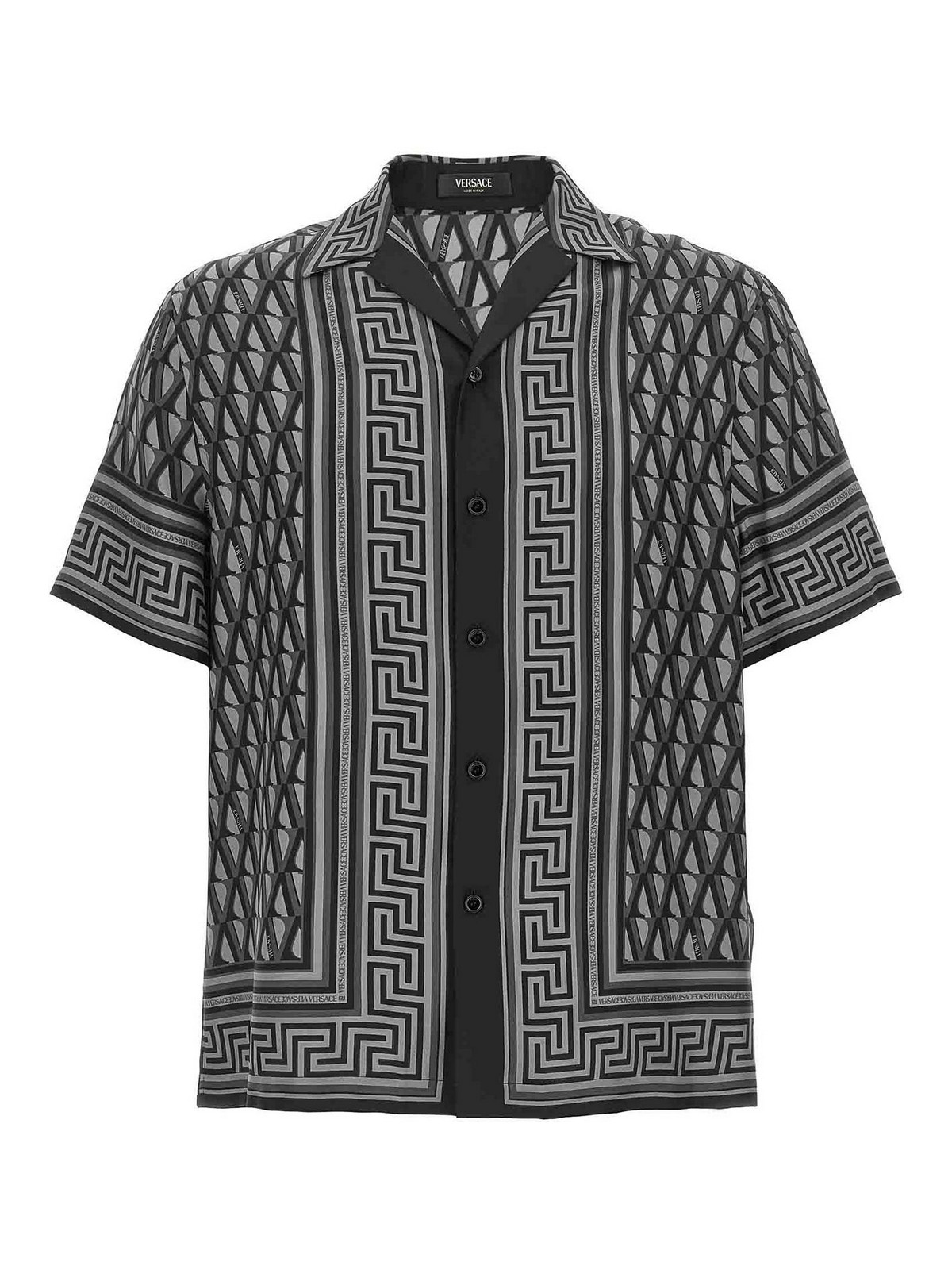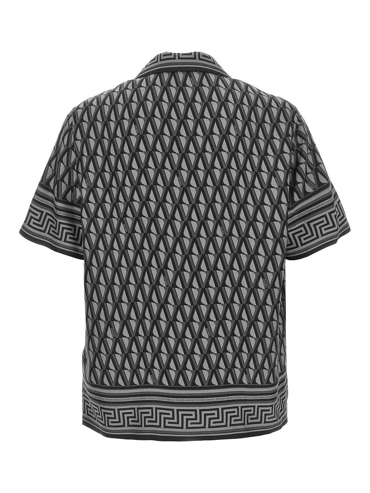 Chemise intégrale en twill de soie à imprimé « V Greca », style bowling, fermeture boutonnée sur le devant, manches courtes, fentes latérales.