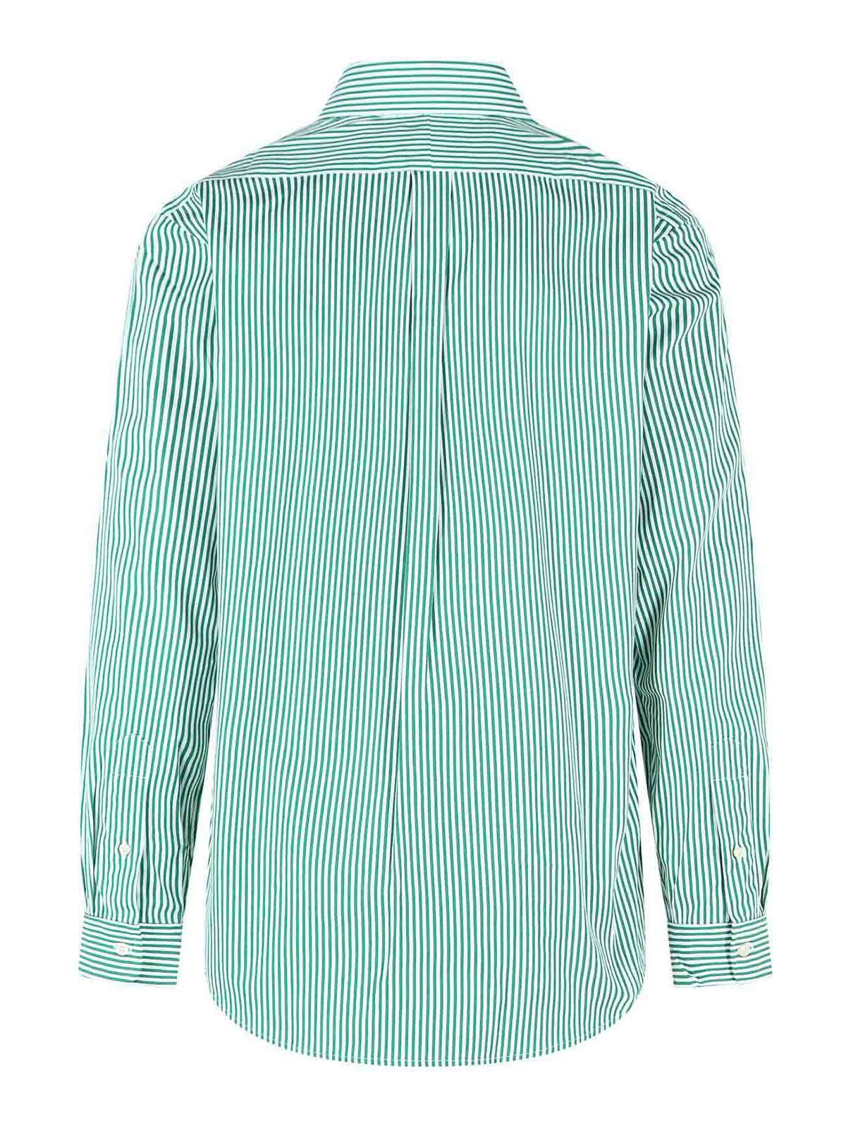 col boutonné, fermeture boutonnée sur le devant, motif à rayures verticales, logo bleu brodé sur la poitrine, poignets boutonnés, pli central au dos, ourlet évasé