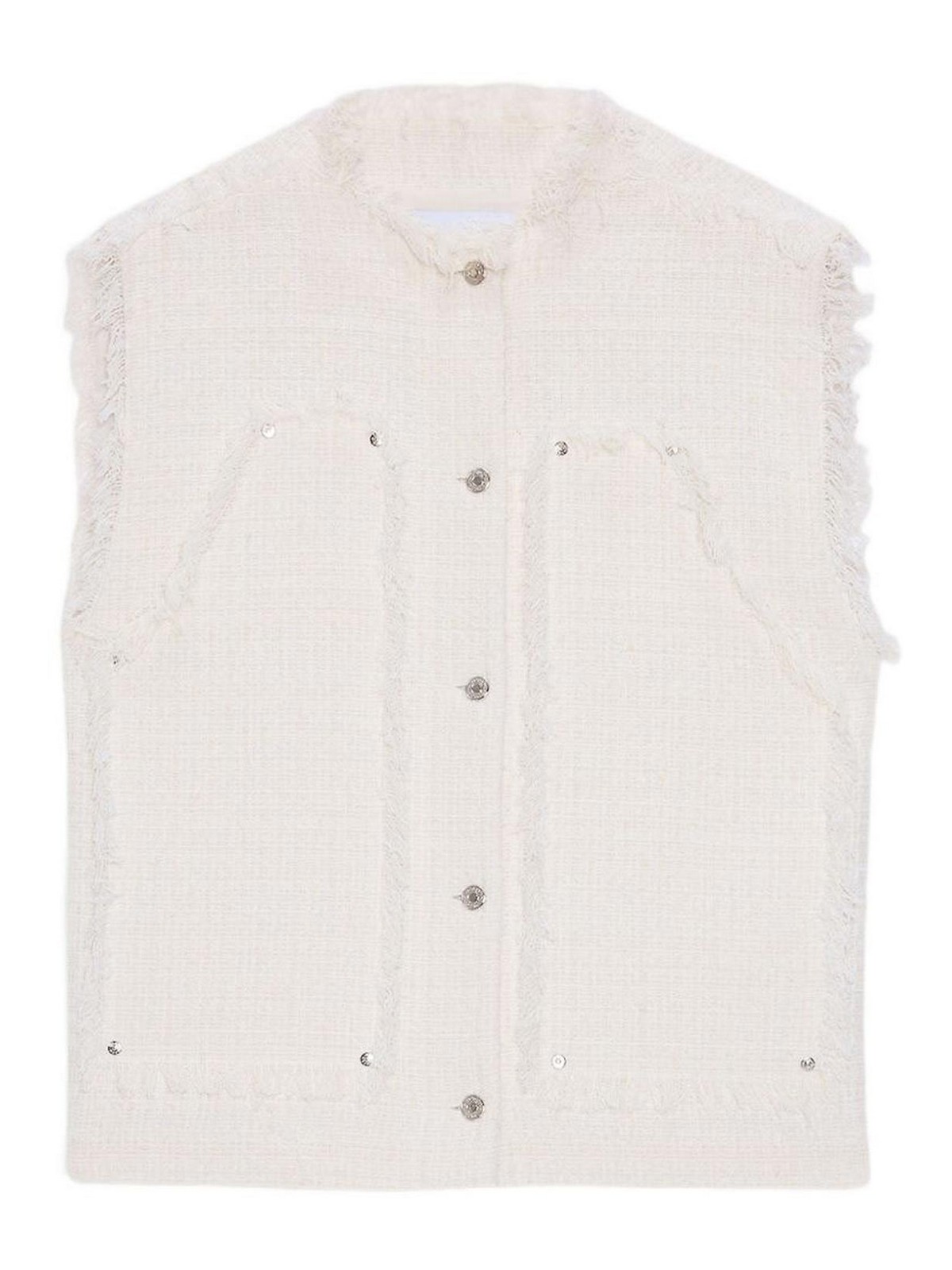 Gilet blanc sans manches en coton à bordure effilochée de la marque msgm, doté d'un col rond, d'une fermeture boutonnée sur le devant et de poches à rabat. Élégant et minimaliste, ce haut associe des détails raffinés à une polyvalence décontractée, le rendant parfait pour les tenues estivales chics ou les looks contemporains de tous les jours. Un ajout féminin et élégant à toute garde-robe moderne