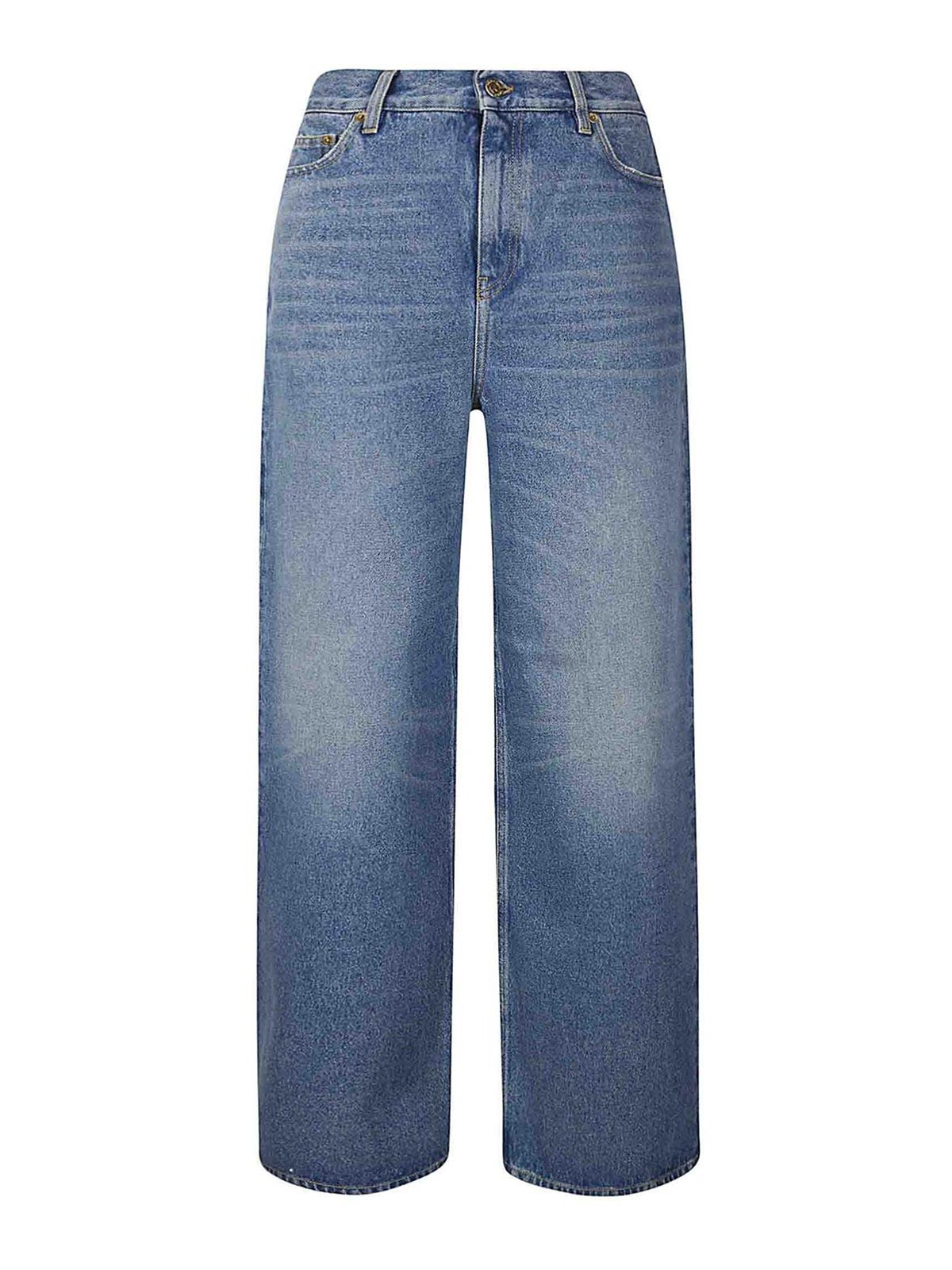 Jean à cinq poches, taille haute, fermeture boutonnée et zippée, jambe large, double étoile au dos.